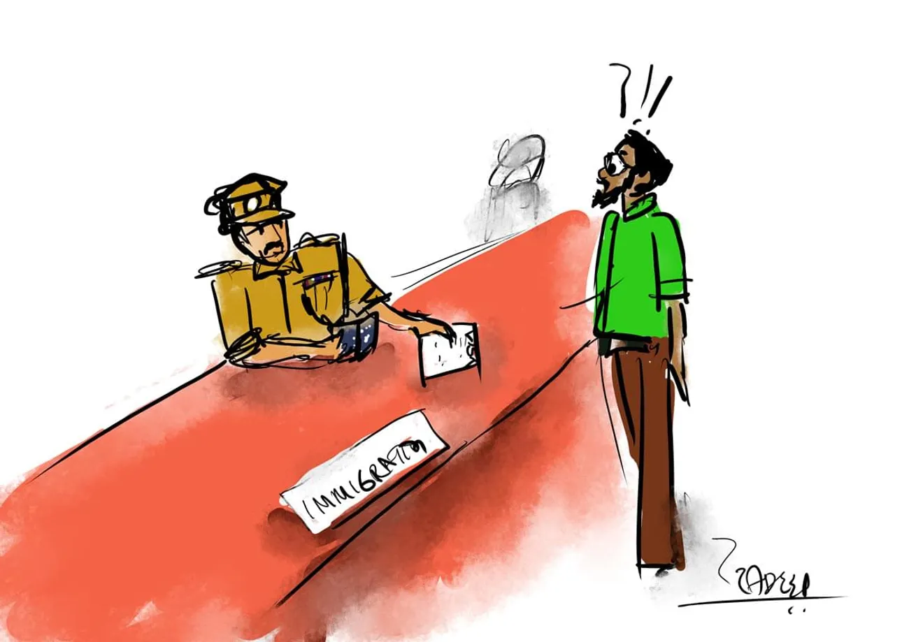 അപ്പോഴേക്കും സെക്യൂരിറ്റി - എമിഗ്രേഷൻ ചെക്കിനുള്ള അനൗൺസ്മെന്റ് വന്നു. അകാംക്ഷയോടെ അങ്ങോട്ടുചെന്നു. ദേഹപരിശോധന കഴിഞ്ഞ് എമിഗ്രേഷൻ ചെക്കിലെത്തി. അവിടെയുള്ള ഉദ്യോഗസ്ഥൻ എന്റെ പാസ്പോർട്ട് വാങ്ങിനോക്കി. അതിനുശേഷം രണ്ടുമൂന്നാവർത്തി വിസയുടെ ഫാക്സ് കോപ്പി നോക്കി. എന്നിട്ട് എന്നൊടു പറഞ്ഞു "ഈ വിസയിൽ അടിച്ചിരിക്കുന്ന പാസ്പോർട്ട് നമ്പർ തെറ്റാണ്. 6 എന്നതിനു പകരം 8 എന്നാണ് അടിച്ചിരിക്കുന്നത്. ഇതുമായി അവിടെച്ചെന്നാൽ വലിയ പ്രയാസമാവും. തന്നെ അവര് പിടിച്ച് അകത്തിടും.""ഞാൻ ആ വിസ നോക്കി. ഫാക്സ് ചെയ്തതായതിനാൽ പാസ്പോർട്ട് നമ്പർ എഴുതിയിരിക്കുന്നത് അത്രയ്ക്ക് വ്യക്തമല്ല. അദ്ദേഹം പറഞ്ഞപോലെ 6 എന്നത് 8 പോലെ തോന്നുകയും ചെയ്യുന്നു! ഞാനാകെ തളർന്നു. ""ഞാനെന്തായാലും ക്ലിയർ ചെയ്ത് തരാം. അവിടെ ചെല്ലുമ്പോൾ പ്രശ്നമുണ്ടാകാതിരുന്നാൽ മതി.'' എന്നു പറഞ്ഞ് അയാൾ സീൽ ചെയ്തു. സോമൻ എന്നൊരു എസ്.ഐ. ആയിരുന്നു അതെന്ന് ആ സീലിൽനിന്ന് പിന്നീട് മനസ്സിലായി.
