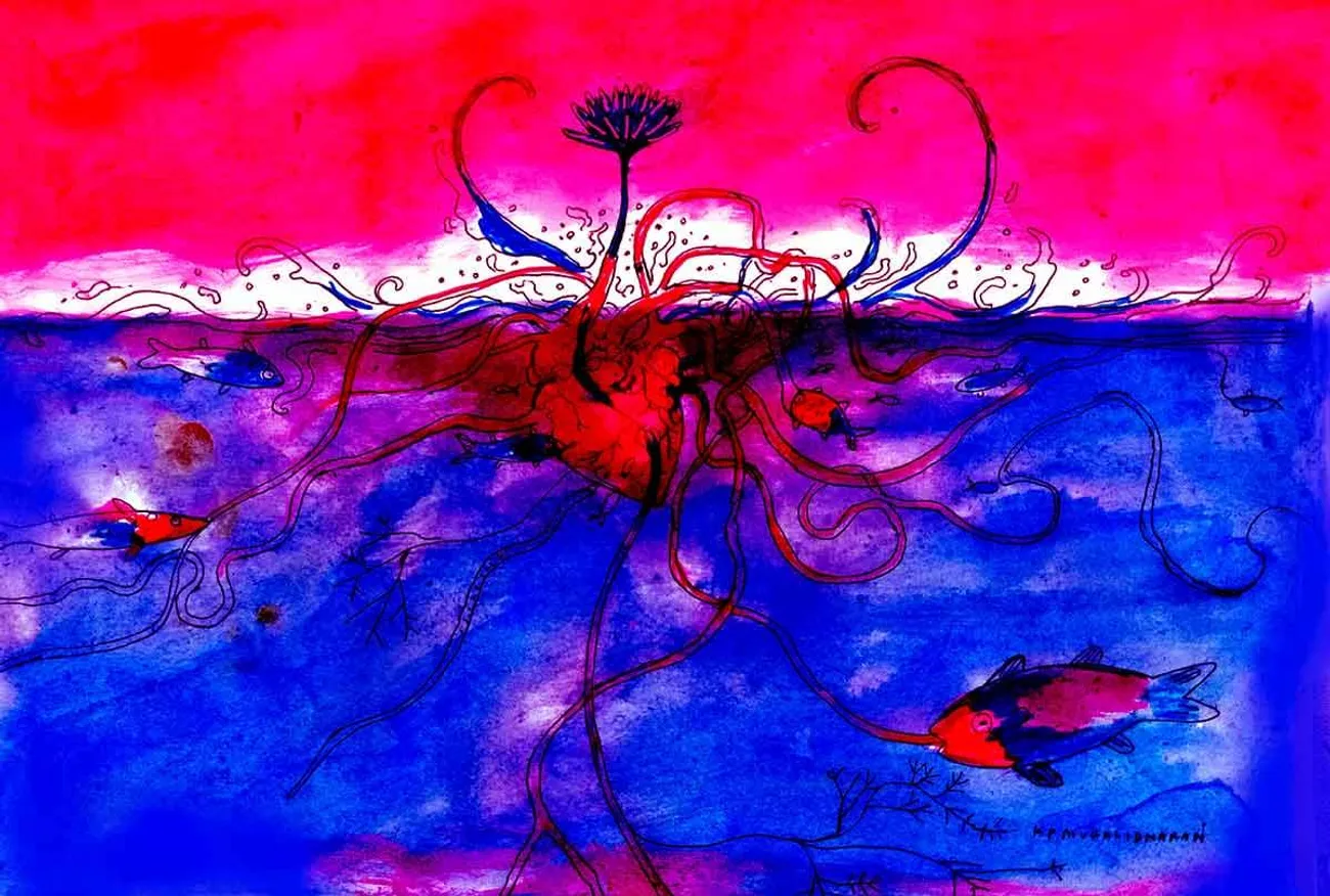 കടലിൽ മത്സ്യങ്ങളും ചെമ്മീനും ഞണ്ടുകളും തിന്നു തുളച്ച് ഓട്ടയായ എന്റെ ഹൃദയം അനാഥത്വത്തോടെ ഒഴുകി.▮