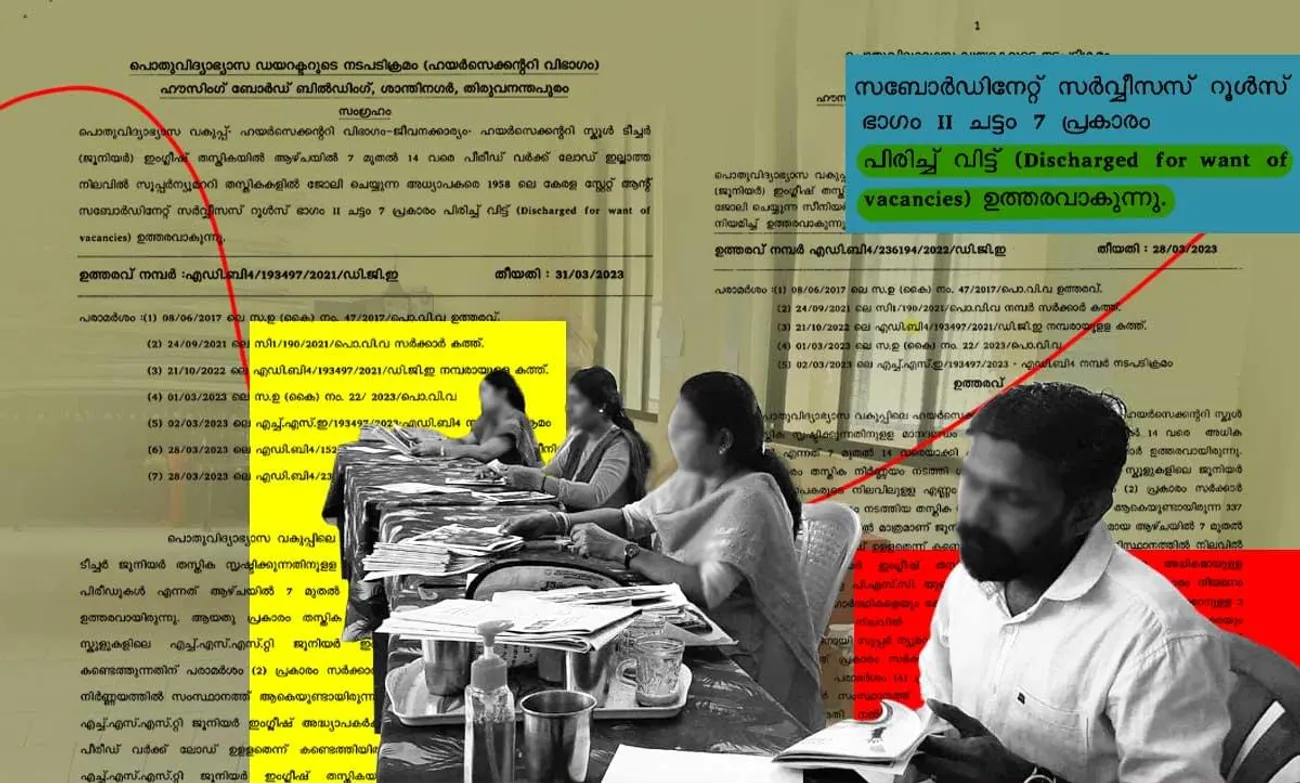 ഇംഗ്ലീഷ് പഠിപ്പിക്കുന്ന 67 ജൂനിയർ അധ്യാപകരെ പിരിച്ചുവിട്ടുകൊണ്ടുള്ള ഒരുത്തരവ് പൊതു വിദ്യാഭ്യാസ വകുപ്പ് ഇറക്കിയിരിക്കയാണ്. (ഉത്തരവ് നമ്പർ എഡിബി 4/ 194397/2021/ഡി.ജി.ഇ dt 31-3-2023. 7 മുതൽ 14 വരെ പീരീഡ് വർക്ക് ലോഡില്ലാത്ത സൂപ്പർ ന്യൂമററി തസ്തികകളിൽ ജോലി ചെയ്യുന്ന അദ്ധ്യാപകരെ 1958ലെ I KSR ഭാഗം 11 ചട്ടം 7 പ്രകാരം പിരിച്ചുവിടുന്ന ഉത്തരവ് )[PDF]. അർഹമായ യോഗ്യതകൾ നേടി മത്സരപരീക്ഷകളിൽ വിജയിച്ച് പി. എസ്. സി തിരഞ്ഞെടുത്ത് 2021 മുതൽ ജോലിയിൽ പ്രവേശിച്ചവരും സേവനം റെഗുലറൈസ് ചെയ്യപ്പെട്ടവരുമായ അദ്ധ്യാപകരെയാണ് 2022-23 സാമ്പത്തിക വർഷത്തിന്റെ അവസാന ദിവസമായ 2023 മാർച്ച് 31ന് ഇറക്കിയ ഈ ഉത്തരവിലൂടെ സ്ഥാനഭ്രഷ്ടരാക്കിയിരിക്കുന്നത്.