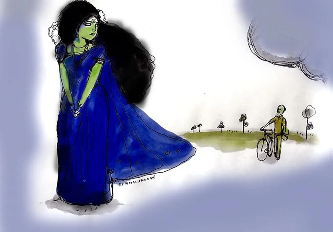ആരായിരിക്കും ഈ കത്തയക്കുന്നത്? എന്തിനായിരിക്കും ഈ കത്തയക്കുന്നത്? ഞാൻ പ്രാണനടർന്ന ദേഹത്തെപ്പോലെ വരാന്തയിൽ ബോധംകെട്ടു വീണു. ആരൊക്കെയോ വെള്ളം കുടഞ്ഞു. എന്റെ കയ്യിലെ കത്തിൽ നീലമഷി കലങ്ങിപ്പരന്നു. കണ്ണീരു കൊണ്ട് എന്റെ മുഖം നനഞ്ഞു.