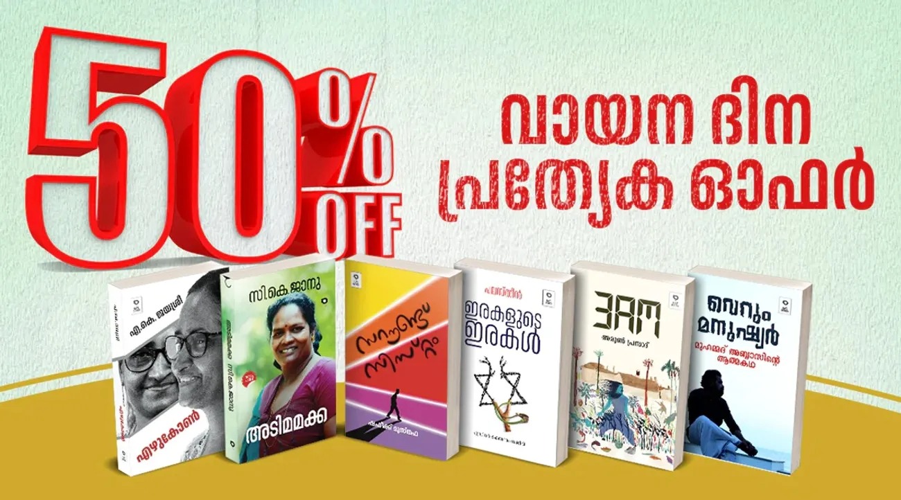 സി.കെ. ജാനുവിന്റെ ആത്മകഥ 'അടിമമക്ക', ഡോ.എ.കെ. ജയശ്രീയുടെ ആത്മകഥ 'എഴുകോൺ', മുഹമ്മദ് അബ്ബാസിന്റെ ആത്മകഥ 'വെറും മനുഷ്യർ', അരുൺ പ്രസാദിന്റെ നോവൽ '3AM', ഷഫീഖ് മുസ്തഫയുടെ കഥാസമാഹാരം 'സറൗണ്ട് സിസ്റ്റം', കമൽറാം സജീവ് എഡിറ്റു ചെയ്ത 'ഇരകളുടെ ഇരകൾ' എന്നീ പുസ്തകങ്ങളാണ് ഇന്ന് 50 ശതമാനം വിലക്കുറവിൽ ലഭിക്കുക.