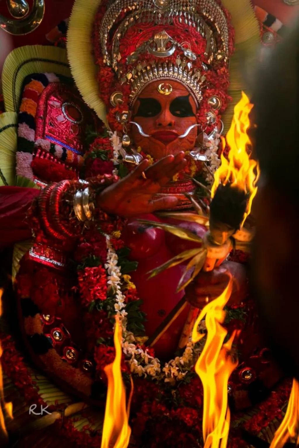 ഇടിവെട്ടിയവൻ്റെ കാലിൽ പാമ്പും കടിച്ചു എന്നൊക്കെയുള്ള പ്രയോഗം പോലെ അതിദയനീയ നിലയുള്ള മൂർത്തി സങ്കൽപ്പം. അവതരിപ്പിക്കുന്ന കോലക്കാരൻ്റെ കാര്യം അതിലും കഷ്ടമാണ്. ശരീരം പൊള്ളിയാലും ഉടലിൽ ബന്ധിച്ച പൂക്കട്ടി മുടിയും ഉടയാടയും തീ പിടിക്കാതിരിക്കേണ്ടതടക്കം സാഹസികമായ ഉത്തരവാദിത്തങ്ങൾ കോലക്കാരനിൽ അർപ്പിതമാണ്. മുടിയിലും അരയിലും ജ്വലിക്കുന്ന തീപ്പന്തങ്ങൾ പോരാഞ്ഞ് കൈവിരൽ പത്തിലും തുണി ചുറ്റി എണ്ണയൊഴിച്ച് കോൽത്തിരി പോലെ കൊളുത്തിയാണ് പുള്ളി ഭഗവതിയെപ്പോലുള്ള തെയ്യങ്ങൾ പുറപ്പെട്ടുവരുന്നത്.