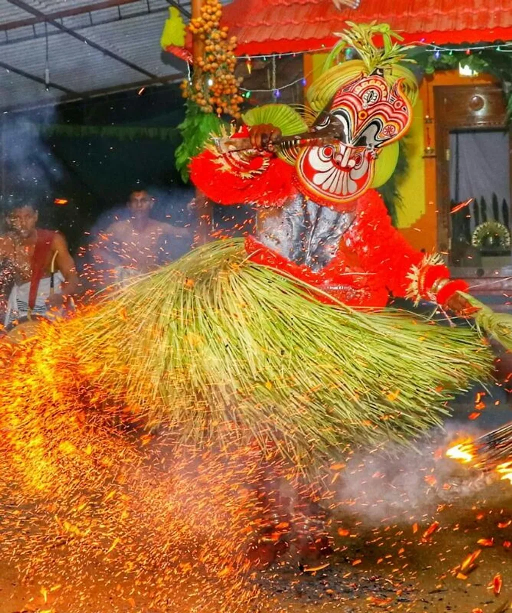 വലിയ അനുഭവസമ്പത്തും ശാരീരികക്ഷമതയും ആത്മവിശ്വാസവും ധൈര്യവും ഇല്ലാതെ ഒരു കോലക്കാരന് തീക്കോലം കെട്ടി മുടിയഴിക്കാനാകില്ല. അരയ്ക്കു ചുറ്റും വലിയ മുടിയിലാകെയും തീപ്പന്തങ്ങൾ കൊളുത്തിയ ദണ്ഡൻ, തീക്കുട്ടിച്ചാത്തൻ തുടങ്ങിയ തെയ്യങ്ങൾ ഒരു തീപ്പമ്പരം പോലെ ഭ്രമണം ചെയ്യുന്ന കാഴ്ച വിസ്മയഭംഗിയുള്ളതാണ്. അരയിൽ കനത്ത പതിനാറ് പന്തങ്ങളുമായി പുറപ്പെടുന്ന കണ്ഠാകർണൻ എന്ന തെയ്യം പീഠത്തിന്മേൽ കയറി നിന്നു കറങ്ങുന്ന ആപത്കരമായ രംഗം ഉള്ളു കിടുങ്ങിപ്പോകുന്ന അനുഭവം തന്നെയാണ്. നിയന്ത്രണാതീതമാകാവുന്ന തീയിൽ കോലധാരിക്ക് അരുതാത്തത് സംഭവിച്ച സന്ദർഭങ്ങളുമുണ്ടായിട്ടുണ്ട്.... അതും വിശ്വാസികളായ നാട്ടുകൂട്ടത്തിനു മുന്നിൽ വെച്ച്.