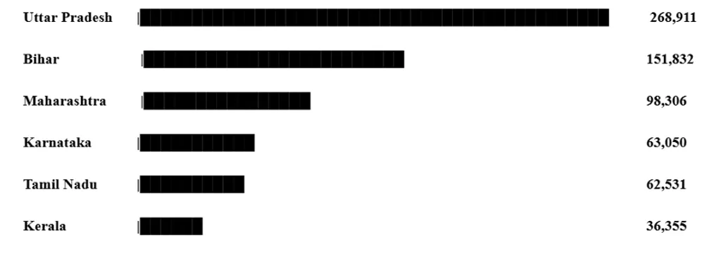 ഏറ്റവും ഉയർന്ന വിഹിതം ലഭിക്കുന്ന ഉത്തർപ്രദേശിനെ 100 ആയി പരിഗണിച്ചാൽ, മറ്റ് സംസ്ഥാനങ്ങൾക്ക് ലഭിക്കുന്ന വിഹിതത്തിന്റെ ആപേക്ഷിക വലിപ്പം താഴെ കാണുന്ന വിധമാണ്: