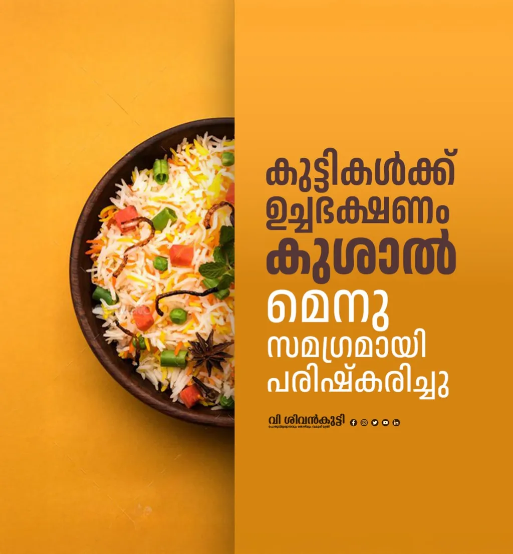 സംസ്ഥാനത്തെ സ്കൂളുകളിലെ ഉച്ചഭക്ഷണ മെനു പുതുക്കിയിരിക്കുകയാണ്. എട്ടാം ക്ലാസ് വരെയുള്ള സൗജന്യ ഉച്ചഭക്ഷണ പദ്ധതിയുടെ മെനുവാണ് വിദ്യാഭ്യാസ വകുപ്പ് പരിഷ്കരിച്ചിരിക്കുന്നത്. ചോറും കറിയും കിട്ടിയിരുന്നിടത്ത് ഇനി മുതൽ എഗ് ഫ്രൈഡ്റൈസ്, ലെമൺ റൈസ്, വെജ് ബിരിയാണി എന്നിവയും മാസത്തിൽ ഒന്നോ രണ്ടോ ദിവസം മൈക്രോ ഗ്രീൻസും കുട്ടികൾക്ക് നൽകും. പുതിന, ഇഞ്ചി, പച്ചമാങ്ങ, നെല്ലിക്ക എന്നിവ ചേർത്തുള്ള ചമ്മന്തി, ആഴ്ചയിലൊരിക്കൽ ഇലയട, കൊഴുക്കട്ട, അവൽ, പായസം എന്നിവയും പരിഷ്കരിച്ച മെനുവിലുണ്ട്. പരിഷ്കരിച്ച ഉച്ചഭക്ഷണ മെനുവിന് വലിയ സ്വീകര്യത ലഭിക്കുമ്പോഴും ഇതിനുള്ള ചെലവ് എങ്ങനെ വഹിക്കുമെന്ന കാര്യത്തിൽ ആശങ്ക നിലനിൽക്കുന്നുണ്ട്.