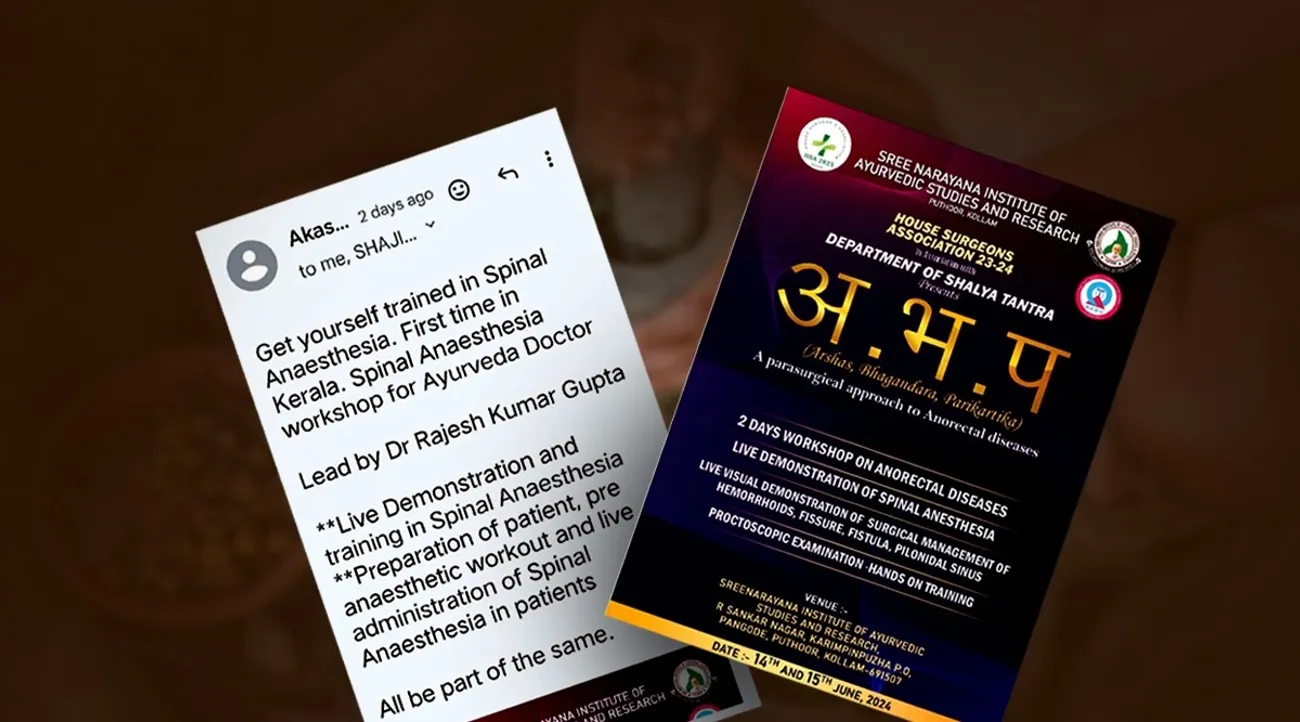 ഇത്തരം ചർച്ചകളൊക്കെ നടന്നുകൊണ്ടിരിക്കേയാണ് കൊല്ലത്തെ 'ശ്രീനാരായണ ഇൻസ്റ്റിറ്റ്യൂട്ട് ഓഫ് ആയുർവേദ സ്റ്റഡീസ് ആൻ്റ് റിസർച്ച്' എന്ന സ്ഥാപനവുമായി ബന്ധപ്പെട്ട് ഒരു സ്പൈനൽ അനസ്തീഷ്യ ട്രെയിനിങ്ങിനെക്കുറിയുള്ള വാർത്തകൾ വരുന്നത്. ആയുർവേദ ബിരുദാനന്തര ബിരുദമുള്ള ഒരു ചികിത്സകൻ സ്പൈനൽ അനസ്തീഷ്യയിൽ ട്രെയിനിങ് നൽകുന്നു എന്ന അറിയിപ്പാണ് മാദ്ധ്യമങ്ങളിൽ വന്നത്. പ്രായോഗികമായും ഔഷധ പ്രയോഗ സംബന്ധിയായും അതുമായി ബന്ധപ്പെട്ട ആൻ്റിബയോട്ടിക് ഉപയോഗ സംബന്ധിയായുമൊക്കെ അങ്ങേയറ്റം ശ്രദ്ധയോടും ശാസ്ത്രീയതയോടെയും കാര്യക്ഷമമായും ചെയ്യേണ്ട ഈ ഗൗരവമാർന്ന അനസ്തീഷ്യാരീതി വളരെ ലാഘവത്തോടെ കൈകാര്യം ചെയ്യുവാൻ തുനിയുന്നവരെക്കുറിച്ച് അത്ഭുതം തോന്നുന്നു. സ്പൈനൽ അനസ്തീഷ്യ എന്നൊരു സങ്കല്പനമേ ആയുർവേദത്തിൽ ഇല്ലെന്നിരിക്കേ, പരിശീലനം നൽകുന്ന ട്രെയിനറുടെ അക്കാദമിക് ബാക്ക്ഗ്രൗണ്ട് നിശ്ചയമായും അറിയാൻ സമൂഹത്തിന് അർഹതയുണ്ട്.