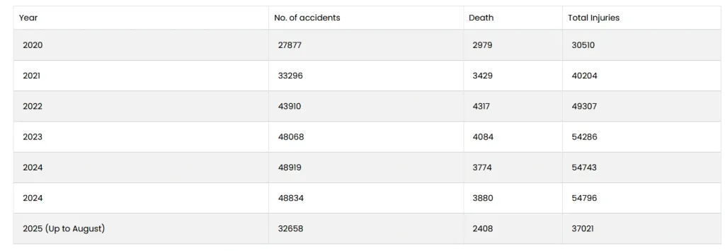 കേരള പോലീസിൻ്റെ കണക്കുകൾ അനുസരിച്ച്, കഴിഞ്ഞ അഞ്ച് വർഷങ്ങളിലെ അപകടങ്ങൾ, മരണം, ഗുരുതരമായി പരിക്കേറ്റവർ എന്നീ വിവരങ്ങൾ താഴെക്കൊടുക്കുന്നു. ഈ പട്ടികയിൽ ഗുരുതരമായ പരിക്കുകൾ മാത്രമാണ് രേഖപ്പെടുത്തുന്നത് എന്നത് ശ്രദ്ധേയമാണ്.