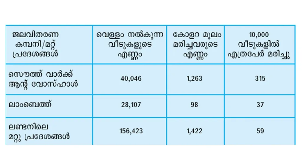 1854 ആഗസ്റ്റിൽ ലണ്ടനിൽ, പ്രത്യേകിച്ച് പടിഞ്ഞാറു ഭാഗത്തുള്ള സോഹോ പ്രദേശത്ത്, വീണ്ടും കോളറ ആവർത്തിച്ച് പ്രത്യക്ഷപ്പെട്ടപ്പോൾ സ്നോ തന്റെ പഠനങ്ങൾ തുടർന്നു. തെയിംസ് നദിയിൽ നിന്നും സോഹോയിൽ വിതരണം ചെയ്യുന്ന വെള്ളത്തിലൂടെ യാവാം രോഗം പടരുന്നതെന്ന പ്രാഥമിക നിഗമനത്തിൽ സ്നോ എത്തിച്ചേർന്നു. കൂടുതലായി നടത്തിയ പരിശോധനയിൽ സോഹോയിലേക്ക് അക്കാലത്ത് രണ്ട് സ്വകാര്യ കമ്പനികളാണ് ജലവിതരണം നടത്തിയിരുന്നതെന്ന് മനസ്സിലാക്കാൻ കഴിഞ്ഞു. അതിലൊരു കമ്പനിയായ സൗത്ത് വാർക്ക് ആന്റ് വോസ്ഹാൾ വാട്ടർ കമ്പനി (Southwark and Vauxhall Water Company) അഴുക്കുചാലുകളി ലൂടെ മാലിന്യങ്ങളെത്തുന്ന തെയിംസിന്റെ താഴ് ഭാഗത്തുനിന്നുമാണ് വെള്ളം പമ്പു ചെയ്യുന്നതെന്നും രണ്ടാമത്തെ കമ്പനിയായ ലാംബെത്ത് (Lambeth Water Company) അഴുക്കുചാലുകൾ തെയിംസിൽ എത്തുന്നതിനുമുകളിൽ നിന്നാണ് ജലം സംഭരിക്കുന്നതെന്നും സ്നോ കണ്ടെത്തി. രണ്ടു കമ്പനികളും വെള്ളം വിതരണം ചെയ്യുന്ന സ്ഥലങ്ങ ളിൽ രോഗികളായവരെയും മരണമടഞ്ഞവരെയും സംബന്ധിച്ചുള്ള വിവരങ്ങൾ ശേഖരിച്ച് സ്ഥലത്തെ ഭൂപടത്തിൽ രേഖപ്പെടുത്തി. കുടിവെള്ള സ്രോതസും മരണമടയുന്നവരുമായുള്ള ബന്ധത്തെ പറ്റിയുള്ള കണക്കെടുപ്പിൽ താഴെ കൊടുക്കുന്ന വിവരങ്ങൾ സ്നോ ശേഖരിച്ചു.
