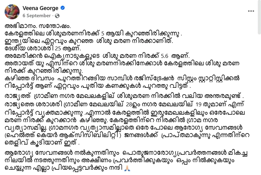 ഒരു പ്രദേശത്തെ ജനങ്ങളുടെ ആരോഗ്യസ്ഥിതി അളക്കുന്ന പ്രധാനപ്പെട്ട രണ്ട് സൂചികകളാണ് ശിശുമരണനിരക്കും മാതൃമരണനിരക്കും. ഇതിൽ ശിശുമരണ നിരക്ക് സാമൂഹ്യ വികസനത്തിന്റെയും മാതൃമരണനിരക്ക് ആശുപത്രി സൗകര്യങ്ങളുടെ സൂചികകൾക്കൊപ്പം സമൂഹത്തിലെ സ്ത്രീപദവിയുടെ സൂചികകൾ കൂടിയായാണ് പരിഗണിക്കപ്പെട്ടു വരുന്നത്. ഇതിൽ രണ്ടിലും കേരളം ഇന്ത്യയിലെ മറ്റു സംസ്ഥാനങ്ങളുമായി അപേക്ഷിച്ച് പതിറ്റാണ്ടുകളായി മുന്നിലാണ്. രാജ്യത്ത് നടത്തപ്പെട്ട സാമ്പിൾ രജിസ്റ്റേഷൻ സർവ്വേ (എസ്.ആർ.എസ്) 2021- 2023 വർഷത്തെ റിപ്പോർട്ടുകൾ പുറത്ത് വന്നതിന് ശേഷം മുൻ വർഷത്തെ അപേക്ഷിച്ച് കേരളത്തിലെ കുറഞ്ഞ് വരുന്ന ശിശുമരണനിരക്കിനെക്കുറിച്ചും അല്പം കൂടിയ മാതൃമരണനിരക്കിനെക്കുറിച്ചും സോഷ്യൽമീഡിയകളിലും പത്രമാധ്യമങ്ങളിലും രാഷ്ട്രീയ ചർച്ചകൾ നടന്നിരുന്നു. ഇതുപ്രകാരം കേരളത്തിലെ ഒരു വയസ്സിൽ താഴെ പ്രായമായിട്ടുള്ള വരിലെ ശിശുമരണനിരക്ക് ആയിരം ജനനങ്ങളിൽ 5-ഉും ഇന്ത്യയിലേത് 25-ഉും ആണ്. മുൻവർഷത്തിലെ നിരക്കായ 6 ൽ നിന്ന് ഒന്ന് കുറഞ്ഞാണ് കേരളം 5-ലെത്തിയത്'. ഇതുസംബന്ധിച്ച് കേരളത്തിലെ ശിശുമരണനിരക്ക് അമേരിക്കയേക്കാൾ കുറവാണെന്ന് താരതമ്യം ചെയ്ത് സംസ്ഥാന ആരോഗ്യ വകുപ്പ് മന്ത്രി വീണ ജോർജ്ജ് സോഷ്യൽ മീഡിയയിൽ പോസ്റ്റ് ചെയ്തിട്ടുമുണ്ടായിരുന്നു. ശിശുമരണനിരക്ക് ഏറ്റവും കൂടുതലുള്ള വടക്കൻ സംസ്ഥാനങ്ങളായ ഉത്തർപ്രദേശിലും മധ്യ പ്രദേശിലും ഇത് 37 ആയിരിക്കുമ്പോൾ ഗോവ, സിക്കീം തുടങ്ങിയ ചെറിയ സംസ്ഥാനങ്ങളിൽ 6-ഉും ഏറ്റവും കുറവ് ലഡാക്കിൽ 4-ഉും മണിപ്പൂരിൽ 3-ഉും ആണ്.