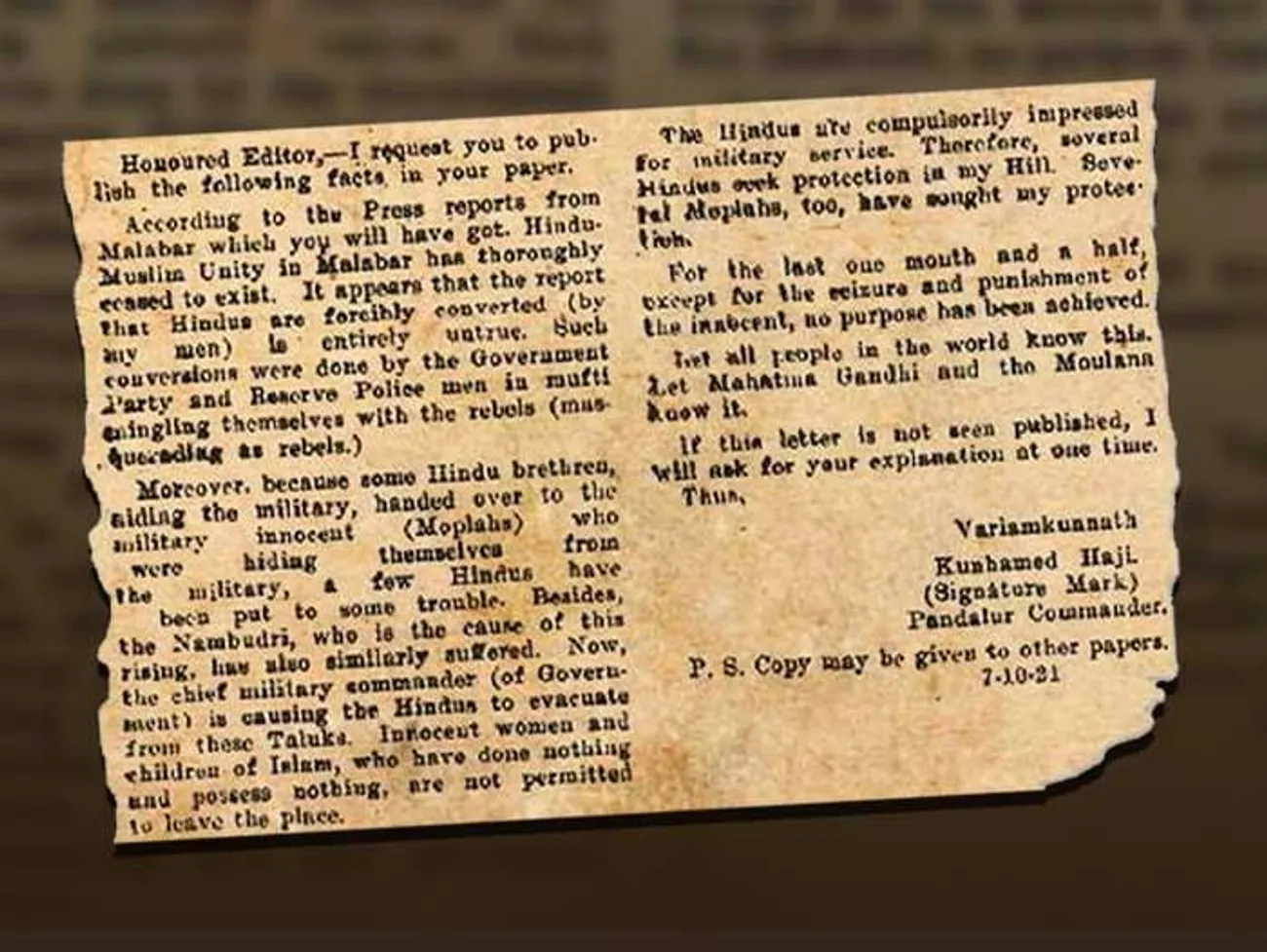 യാഥാർഥ്യത്തെയും ഓർമ്മയെയും മായ്ച്ച് കളഞ്ഞ് കൊളോണിയൽ ഭാവനയിൽ പുതിയ മാപ്പിളയെ സൃഷ്ടിച്ചെടുക്കുന്ന "സിവിലൈസിങ് വിദ്യ'യും അതിനെത്തുടർന്നുള്ള ചരിത്ര രചനകളെ അപനിർമിക്കുന്നതിൽ തദ്ദേശീയരുടെ വാമൊഴികൾ, തലമുറകളായി കൈമാറ്റം ചെയ്യപ്പെട്ട ഓർമകൾ, ഡയറിക്കുറിപ്പുകൾ, കത്തുകൾ, റിപ്പോർട്ടുകൾ തുടങ്ങിയവയുടെ പങ്ക് വളരെ വലുതാണ്. ആ അർത്ഥത്തിൽ വാൾട്ടർ ബെന്യാമിൻ സൂചിപ്പിച്ചതുപോലെ, മലബാർ കലാപ ചരിത്രത്തിൽ മിന്നിമറയുന്ന ഓർമയുടെ/ ചരിത്രത്തിന്റെ ശേഷിപ്പാണ് മലബാർ സമരത്തിന്റെ വീരനായകൻ വാരിയം കുന്നത്ത് കുഞ്ഞഹമ്മദ് ഹാജി പന്തല്ലൂരിൽ നിന്ന് "ദി ഹിന്ദു' പത്രത്തിലേക്കയച്ച കത്ത്.