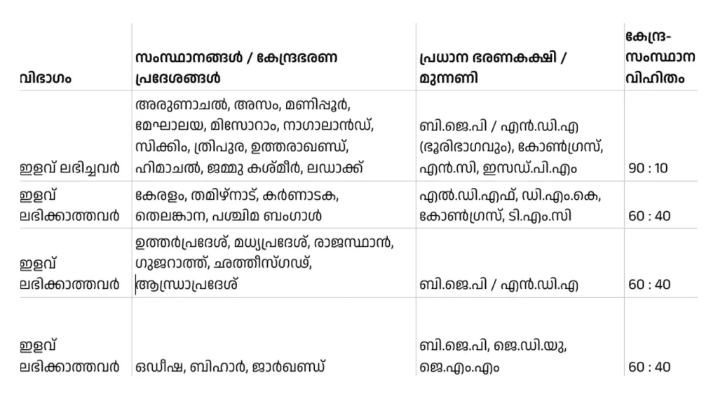 ഈ പട്ടിക പരിശോധിക്കുമ്പോൾ വ്യക്തമാകുന്ന ഒരു പ്രധാന കാര്യം, സാമ്പത്തിക ഇളവ് ലഭിച്ച സംസ്ഥാനങ്ങളിൽ ഭൂരിഭാഗവും വടക്കുകിഴക്കൻ-മലയോര മേഖലയിലുള്ള ബി.ജെ.പി ഭരണത്തിന് കീഴിലുള്ളവയാണ് എന്നതാണ്. ഭൂമിശാസ്ത്രപരമായ കാരണങ്ങളാലാണ് ഇങ്ങനെ എന്നുള്ള എതിർവാദമാണ് ഈ ചർച്ചയ്ക്കെതിരെ സർക്കാർ നടത്തുന്നതെങ്കിലും, ഇന്ത്യയുടെ ജി.ഡി.പിയിലേക്ക് വലിയ സംഭാവന നൽകുന്ന കേരളം ഉൾപ്പെടെയുള്ള ദക്ഷിണേന്ത്യൻ സംസ്ഥാനങ്ങളെ 60:40 എന്ന കടുത്ത അനുപാതത്തിൽ ഉൾപ്പെടുത്തിയത് സർക്കാരിന്റെ സാമ്പത്തികമായ ഇരട്ടത്താപ്പാണെന്ന വിമർശനം ശക്തമാണ്. പ്രത്യേകിച്ച് കേരളം, തമിഴ്നാട്, കർണാടക തുടങ്ങിയ പ്രതിപക്ഷ കക്ഷികൾ ഭരിക്കുന്ന സംസ്ഥാനങ്ങളിൽ തൊഴിലുറപ്പ് വേതനം ദേശീയ ശരാശരിയേക്കാൾ കൂടുതലായതിനാൽ, 40% വിഹിതം സ്വയം കണ്ടെത്തുക എന്നത് ഈ സംസ്ഥാനങ്ങളുടെ ബജറ്റ് വിഹിതത്തെ സാരമായി ബാധിക്കും. ഉത്തർപ്രദേശ്, മധ്യപ്രദേശ് തുടങ്ങിയ ബി.ജെ.പി ഭരിക്കുന്ന വലിയ സംസ്ഥാനങ്ങളും 60:40 പട്ടികയിൽ ഉണ്ടെങ്കിലും, അവിടത്തെ കുറഞ്ഞ വേതന നിരക്ക് അവർക്കുള്ള സാമ്പത്തിക ഭാരം കുറയ്ക്കുന്നു. ചുരുക്കത്തിൽ, രാഷ്ട്രീയ സ്വാധീനമുള്ള വടക്കൻ സംസ്ഥാനങ്ങൾക്ക് ഇളവുകൾ ലഭിക്കുമ്പോൾ, മികച്ച രീതിയിൽ പദ്ധതി നടപ്പിലാക്കുന്ന ദക്ഷിണേന്ത്യൻ സംസ്ഥാനങ്ങൾക്ക് മേൽ അധിക സാമ്പത്തിക ബാധ്യത അടിച്ചേൽപ്പിക്കുന്നത് ഫെഡറൽ തർക്കങ്ങളുടെ തുടർച്ചതന്നെയാണ് എന്നതിൽ തർക്കമില്ല.