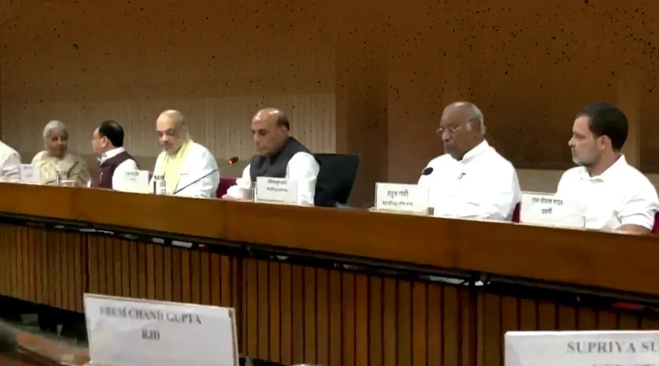 ആഭ്യന്തര മന്ത്രി അമിത് ഷാ, രാജ്നാഥ് സിങ് എന്നിവരുടെ നേതൃത്വത്തിലായിരുന്നു യോഗം. പ്രധാനമന്ത്രി നരേന്ദ്രമോദി പങ്കെടുത്തില്ല. തൃണമൂൽ കോൺഗ്രസ് നേതാവ് സന്ദീപ് ബന്ദോപാധ്യായ, ഡി.എം.കെ നേതാവ് ടി. ആർ. ബാലു എന്നിവരടക്കമുള്ള പ്രതിപക്ഷ നേതാക്കൾ, ധനകാര്യമന്ത്രി നിർമല സീതാരാമൻ, വിദേശകാര്യമന്ത്രി എസ്. ജയശങ്കർ തുടങ്ങിയവരും പങ്കെടുത്തു. രാം ഗോപാൽ യാദവ് (സമാജ്വാദി പാർട്ടി), സഞ്ജയ് സിങ് (ആപ്പ്), സഞ്ജയ് റൗട്ട് (ശിവസേന- ഉദ്ധവ്), സുപ്രിയ സുലേ (എൻ.സി.പി- എസ്.പി), സസ്മിത് പത്ര (ബി.ജെ.ഡി), ജോൺ ബ്രിട്ടാസ് (സി.പി.എം), അസദ്ദുദ്ദീൻ ഒവൈസി തുടങ്ങിയവരും യോഗത്തിൽ പങ്കെടുത്തു.