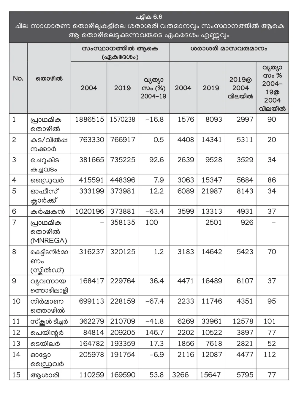 കയർ, കശുവണ്ടി, ഓട്, കൈത്തറി തുടങ്ങിയ പരമ്പരാഗത വ്യവസായങ്ങളിൽ തൊഴിലെടുക്കുന്നവരുടെ എണ്ണത്തിൽ 82 ശതമാനത്തിന്റെ ഇടിവുണ്ട്. അതേസമയം ആധുനിക വ്യവസായങ്ങളിൽ 36 ശതമാനത്തിന്റെ വർധനവുണ്ട്.
