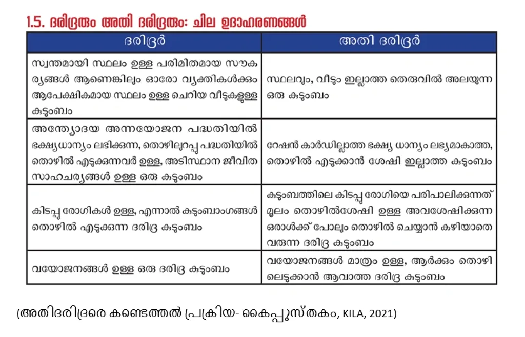 ഈ രീതിയിൽ, "AAY പദ്ധതിയില് ഭക്ഷ്യധാന്യം ലഭിക്കുന്ന" (അടിസ്ഥാന ജീവിതസാഹചര്യങ്ങളുള്ള) ഒരു കുടുംബം വെറും ‘ദരിദ്രർ’ ആയും, "റേഷന് കാർഡില്ലാത്ത, ഭക്ഷ്യധാന്യം ലഭ്യമാകാത്ത, തൊഴിലെടുക്കാന് ശേഷിയില്ലാത്ത കുടുംബം", ‘അതിദരിദ്രർ’ ആയും പരിഗണിക്കപ്പെടുന്നു.