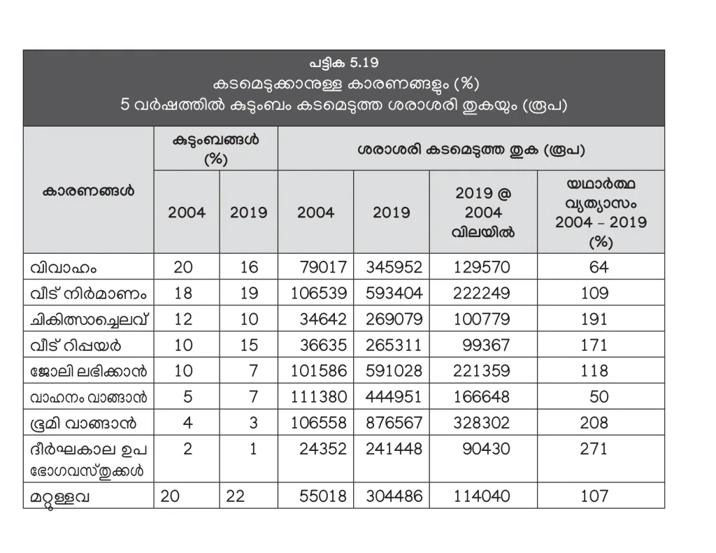 മലയാളിയെ കടത്തിലാക്കുന്ന രണ്ട് വലിയ ചെലവുകൾ വിവാഹവും അപ്രതീക്ഷിത ചികിത്സാച്ചെലവുമാണെന്ന് കേരള പഠനം ചൂണ്ടിക്കാണിക്കുന്നു. കഴിഞ്ഞ അഞ്ചു വർഷത്തിലെ വിവാഹച്ചെലവിനെക്കുറിച്ച് സർവേയിൽ ലഭ്യമായ ഉത്തരങ്ങളുടെ അടിസ്ഥാനത്തിൽ, കേരളത്തിൽ ഒരു വർഷം 22,810 കോടി രൂപയുടെ ചെലവുണ്ടാകുന്നുണ്ട്. (2004-ലെ വിലനിലവാരത്തിൽഇത് 8448 കോടി വരും). 2004-ലെ സർവേയിൽ ഇത് 6787 കോടിയായിരുന്നു. ഇതുവഴി ഓരോ കുടുംബത്തിനും വർഷം 28,338 രൂപയുടെ ബാധ്യത വരുന്നുണ്ട്. സംസ്ഥാനത്തിന്റെ മൊത്തം കുടുംബവരുമാനത്തിന്റെ ഏതാണ്ട് 8.2 ശതമാനം വരുന്ന തുകയാണിത്. എന്നാൽ, 2004-നെ അപേക്ഷിച്ച് ഇതിൽ 14.7 ശതമാനത്തിന്റെ കുറവ് കാണിക്കുന്നുണ്ട്.