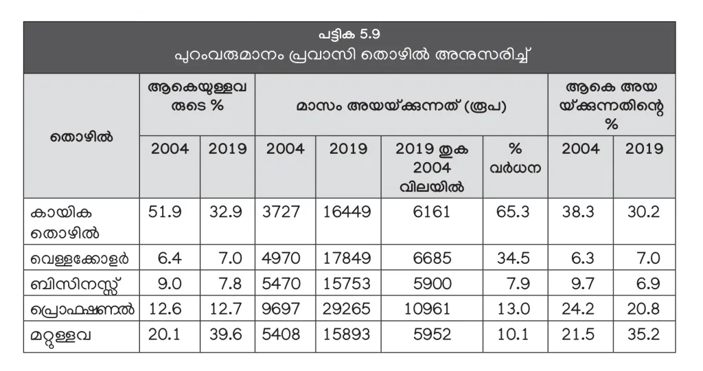 മൂന്നിലൊന്ന് മുസ്ലിം കുടുംബങ്ങളിൽ ഒരാൾ പുറത്ത് പണിയെടുക്കുന്നു. എസ്.സി- എസ്.ടി കുടുംബങ്ങളിൽ പുറത്ത് പണിയെടുക്കുന്നവർ വളരെ കുറവാണ്. പ്രവാസികളിൽനിന്ന് കൂടുതൽ വരുമാനം ലഭിക്കുന്ന കുടുംബങ്ങൾ മുന്നാക്ക ക്രിസ്ത്യാനികളുടേതാണ്. താഴ്ന്ന- ഉയർന്ന ഇടത്തരം വിഭാഗങ്ങളിലാണ് പ്രവാസികൾ കൂടുതൽ.
