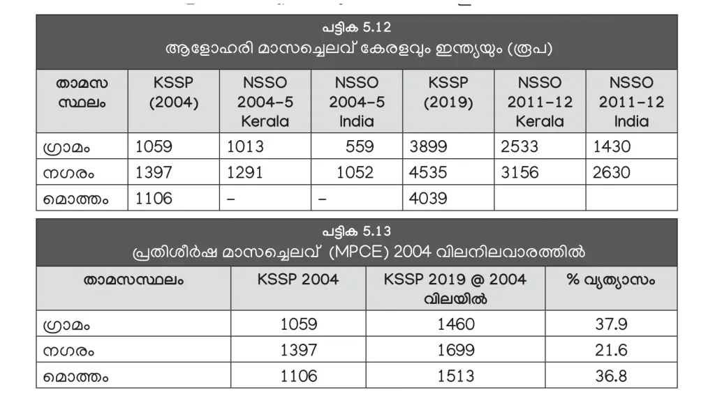 ഒരു കുടുംബത്തിന്റെ ശരാശരി മാസച്ചെലവ് 15,737 രൂപയാണ്. 2004-ലെ സർവേയിൽ ഇത് 5894 രൂപയായിരുന്നു. അതായത്, ചെലവിലെ വർധന 31.5 ശതമാനം. ജീവിതനിലവാരത്തിൽ മൊത്തത്തിലുണ്ടായ വർധനവിനെയാണ് ഇത് സൂചിപ്പിക്കുന്നത്. അതിദരിദ്ര വിഭാഗങ്ങളിൽ ഒരു കുടുംബത്തിന്റെ മാസച്ചെലവ് 5481 രൂപയും ഉയർന്ന ഇടത്തരം കുടുംബത്തിൻേറത് 26,329 രൂപയുമാണ്. ഉയർന്ന ഇടത്തരം കുടുംബം, അതിദരിദ്ര കുടുംബത്തേക്കാൾ 5.7 ഇരട്ടി പണം പ്രതിമാസം ചെലവാക്കുന്നു. 2004-ല ഇത് 3.8 ഇരട്ടിയായിരുന്നു. ഉയർന്ന ഇടത്തരം കുടുംബം പ്രധാനമായും പണം ചെലവാക്കുന്നത് ഫോൺ ബിൽ, വിനോദപരിപാടികൾ, ദീർഘസ്ഥായീ ഉപഭോഗവസ്തുക്കൾ എന്നിവയ്ക്കാണ്.