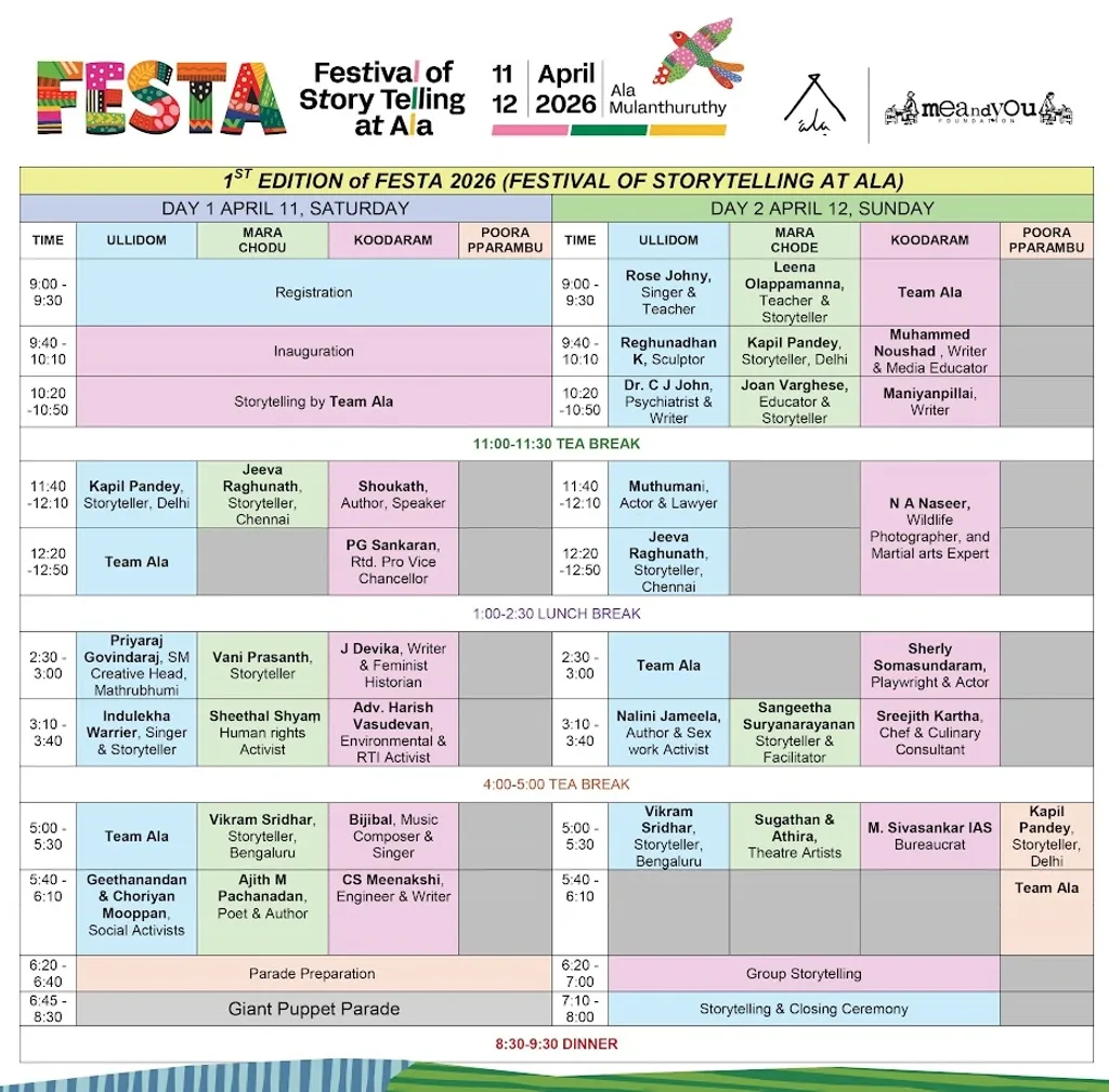 2026 ഏപ്രിൽ 11–12 തീയതികളിലായി എറണാകുളം ജില്ലയിലെ മുളന്തുരുത്തിയിലുള്ള ആല ബദൽ വിദ്യാഭ്യാസ സാംസ്കാരിക കേന്ദ്രം രണ്ട് ദിവസം നീണ്ടു നിൽക്കുന്ന ദേശീയ കഥോത്സവം ‘ഫെസ്റ്റ 2026’ (ഫെസ്റ്റിവൽ ഓഫ് സ്റ്റോറിടെല്ലിംഗ് അറ്റ് ആല) സംഘടിപ്പിക്കുന്നു.
