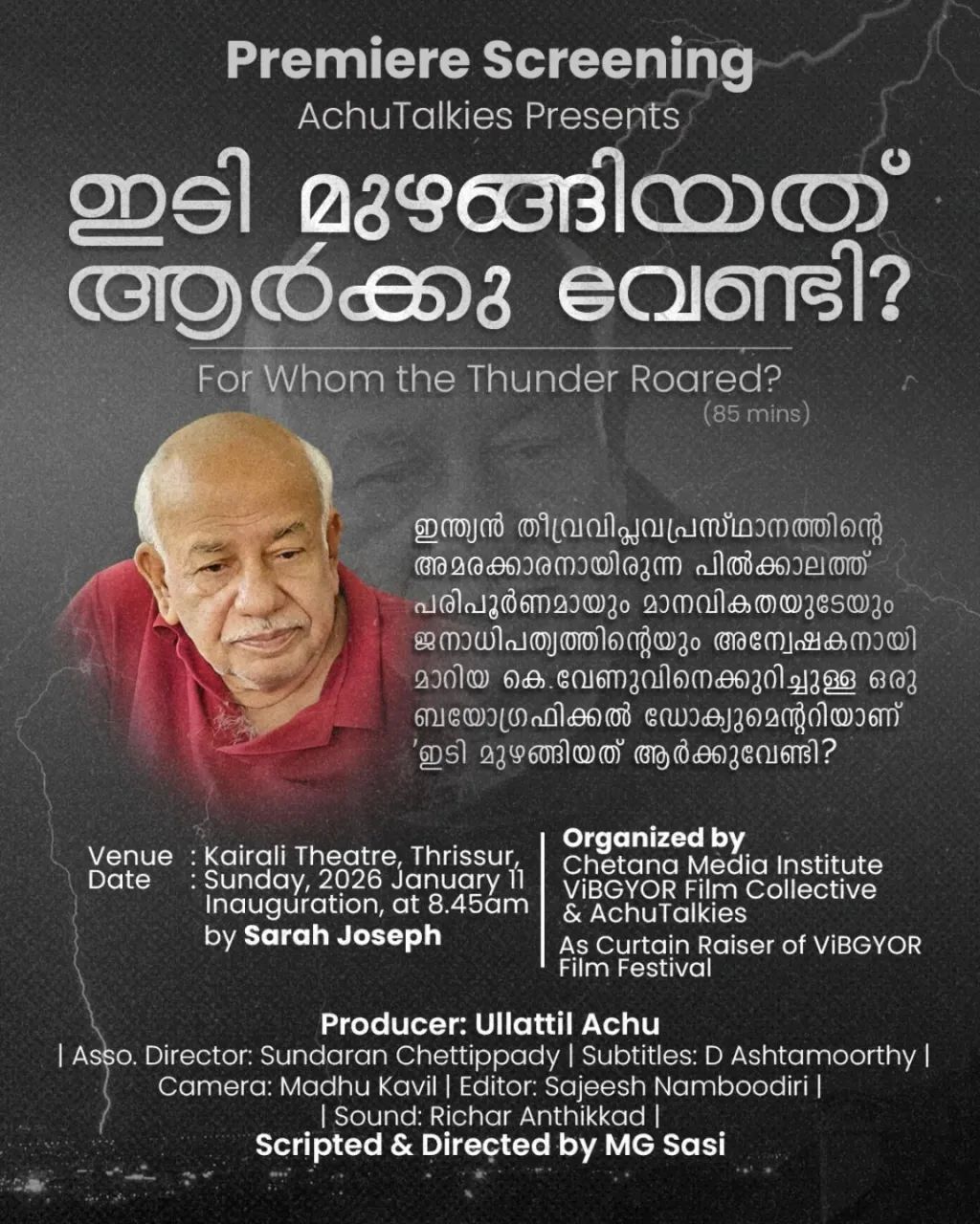 രാഷ്ട്രീയ സൈദ്ധാന്തികനും സാമൂഹ്യ പ്രവർത്തകനുമായ കെ. വേണുവിന്റെ ജീവിതത്തെ പറയുന്ന "ഇടി മുഴങ്ങിയത് ആർക്കുവേണ്ടി" എന്ന ഡോക്യുമെന്ററി കഴിഞ്ഞ ദിവസം കാണുമ്പോൾ ആദ്യം മനസ്സിൽ വന്നത് വേണുവും, വേണുവിന്റെ 'രാഷ്ട്രീയ തലമുറ'യും, സമൂഹത്തെയും രാഷ്ട്രീയത്തെയും കാണുന്നതിലെ പ്രകടമായ പിളർപ്പായിരുന്നു: സ്വന്തം രാഷ്ട്രീയ ജീവിതത്തെ ജീവിതത്തിന്റെയും ജീവിതാർത്ഥത്തിന്റെയും കഥകൂടിയാക്കുന്ന വേണു, ഒരിക്കൽ സ്വാധീനിച്ചിരുന്ന "മാവോയിസ്റ്റ്" ('നക്സലൈറ്റ്' ) ആശയശാസ്ത്രത്തിൽ നിന്നുമുള്ള വിടുതിയാണ് തന്റെ ചിന്താലോകത്തിന്റെ വിഛ്ച്ചേദമായി അടയാളപ്പെടുത്തുന്നതെങ്കിൽ, വേണുവിന്റെ "രാഷ്ട്രീയ സുഹൃത്തുക്കൾ", വിശേഷിച്ചും ആ തലമുറയിലുള്ളവർ, ഇതേ ആശയത്തിന്റെ ഗൃഹാതുരത്വത്തോളം പോയ 'ഭൂത'ത്തിന്റെ പവിത്ര സംരക്ഷകരുമാകുന്നു. ഇതാണ് ആ പിളർപ്പ്.