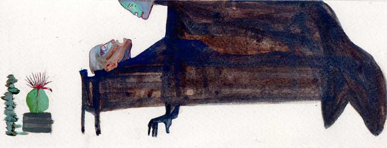 അപ്പാപ്പനത് അനുഭവിച്ച് കഴിഞ്ഞതിനാൽ മരണം പറയുന്നതിനെ എതിർക്കുവാൻ കഴിഞ്ഞില്ല. അപ്പാപ്പൻ മരണത്തിനൊപ്പം തന്റെ ദേഹത്തെ നോക്കി നിന്നു. ഉമിനീർ, രക്തം, വിയർപ്പ്, മൂത്രം, ശുക്ലം എന്നിവ വറ്റിത്തുടങ്ങുകയായിരുന്നു. നാവിന്റെ കടഭാഗം നീലിച്ചു പോയിരുന്നു. മരണം തുടർന്നു,