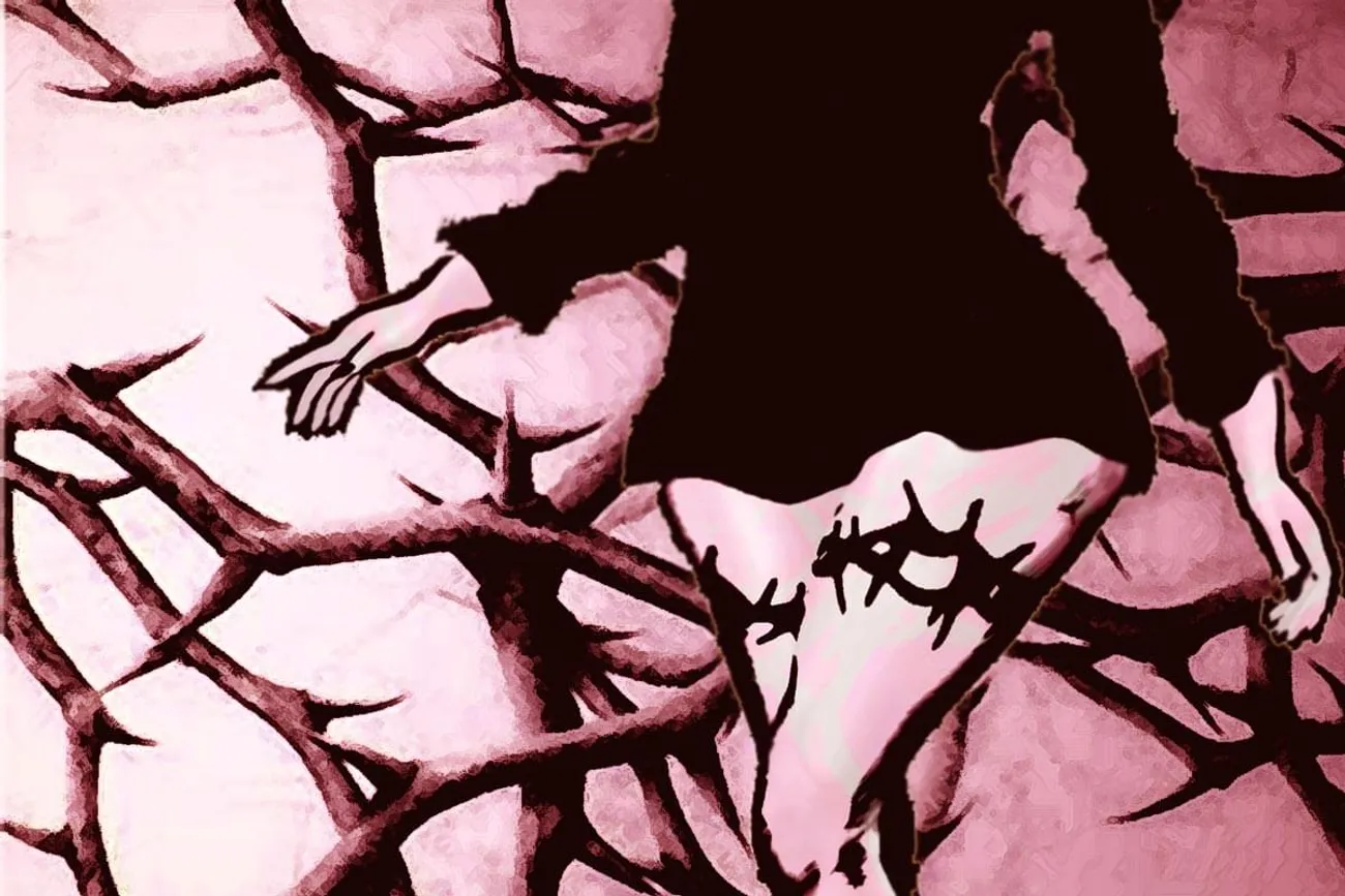 കാലിൽ നിറയെ മുള്ളുകൾ വരച്ചു വെച്ചിരിക്കുന്നു. തുടകളിൽ നിന്ന് കയറി അത് കുട്ടിയുടുപ്പിന്റെ ഉള്ളിലേയ്ക്ക് പോയി മറഞ്ഞിരിക്കുന്നു. ഇടയ്ക്കോരോ കൂരമ്പും കാണാം.