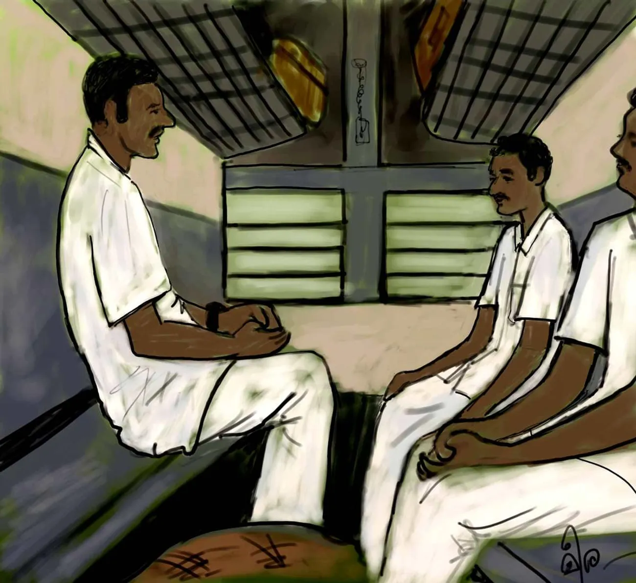 ‘പാലക്കാട്ട് യാത്രക്ക് കോമ്പാറ പൈലീടെ ഒറ്റക്കാളവണ്ടീലാണ് കറുപ്പയ്യ വെല്യച്ചൻ തീവണ്ടിയാപ്പീസിലിക്ക് പോയത്. മ്മടെ ചേന്ദന്റെ അച്ചാച്ചൻ ഒരു താമീണ്ടാർന്നു. അവൻ കൂട്ടുപോയി. കല്ലേറ്റുങ്കരേന്ന് ഷൊർണൂർക്ക് വണ്ടീല്. അവടെ ഒരുദിവസം കെടന്ന് പിറ്റേന്ന് പൊലർച്ചക്കാണ് ഒലവക്കോട്ടെക്കൊള്ള വണ്ടി കിട്ട്യേത്. ഷൊർണ്ണൂര് പൊഴേല് പോയിട്ട് അവരു കുളിച്ചു. പൊഴക്കരേലെ മണലില് താമി അടുപ്പുകൂട്ടി കഞ്ഞി വെച്ചു. ചമ്മന്തിപ്പൊടീം അച്ചാറും ഇവടന്ന് കൊണ്ടോയേർന്നു.'