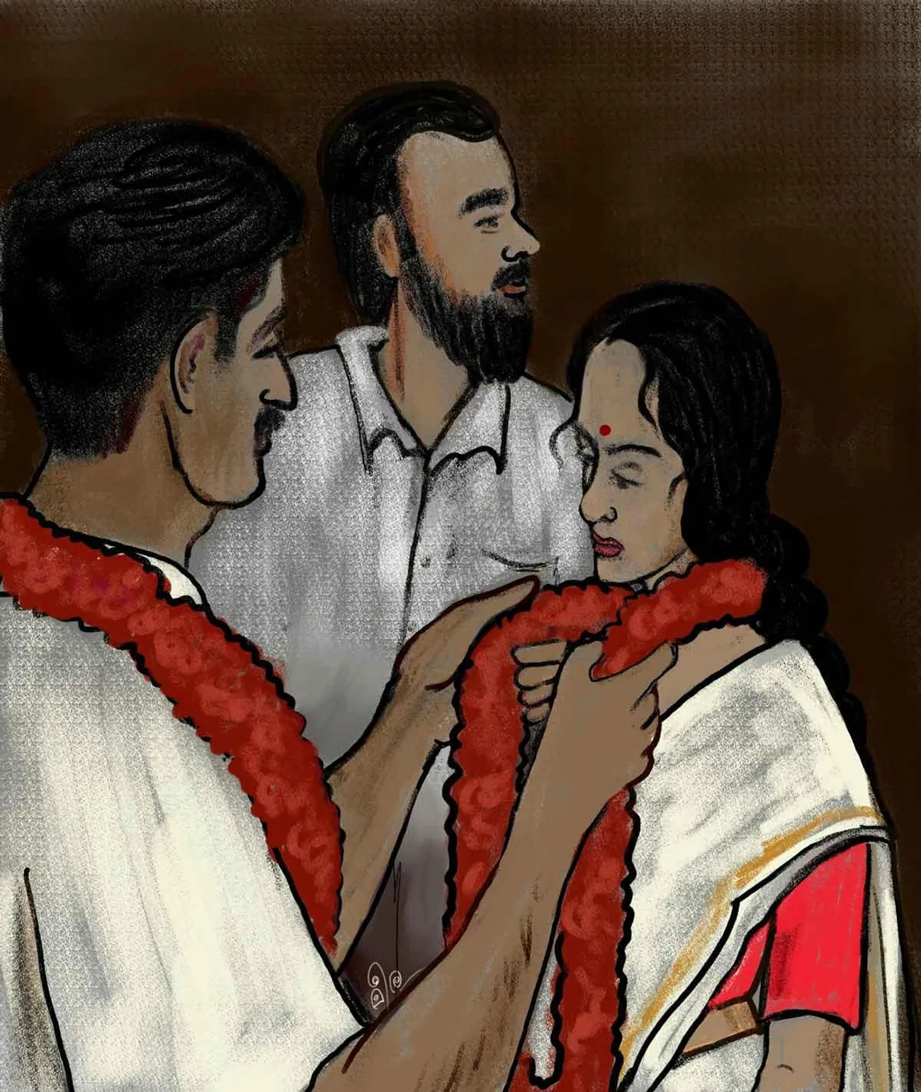 ദിമിത്രിയുടെ അച്ഛനും അമ്മയും തമ്മിലുള്ള വിവാഹത്തിന് മുന്നിൽനിന്ന ചക്രപാണിവാര്യരെ നമ്മൾ കണ്ടതാണല്ലോ. കാട്ടൂർക്കടവ് റിക്കാർഡ് കച്ചേരിയിൽ ആ വിവാഹത്തിന് അദ്ദേഹം സാക്ഷിയായിരുന്നു. ബോട്ടുകടവിലെ പാർട്ടി ആപ്പീസിൽ വെച്ച് ദമ്പതികൾ പരസ്പരം മാലയിട്ടു. ചെറിയൊരു തേയിലസൽക്കാരം ഉണ്ടായിരുന്നു.