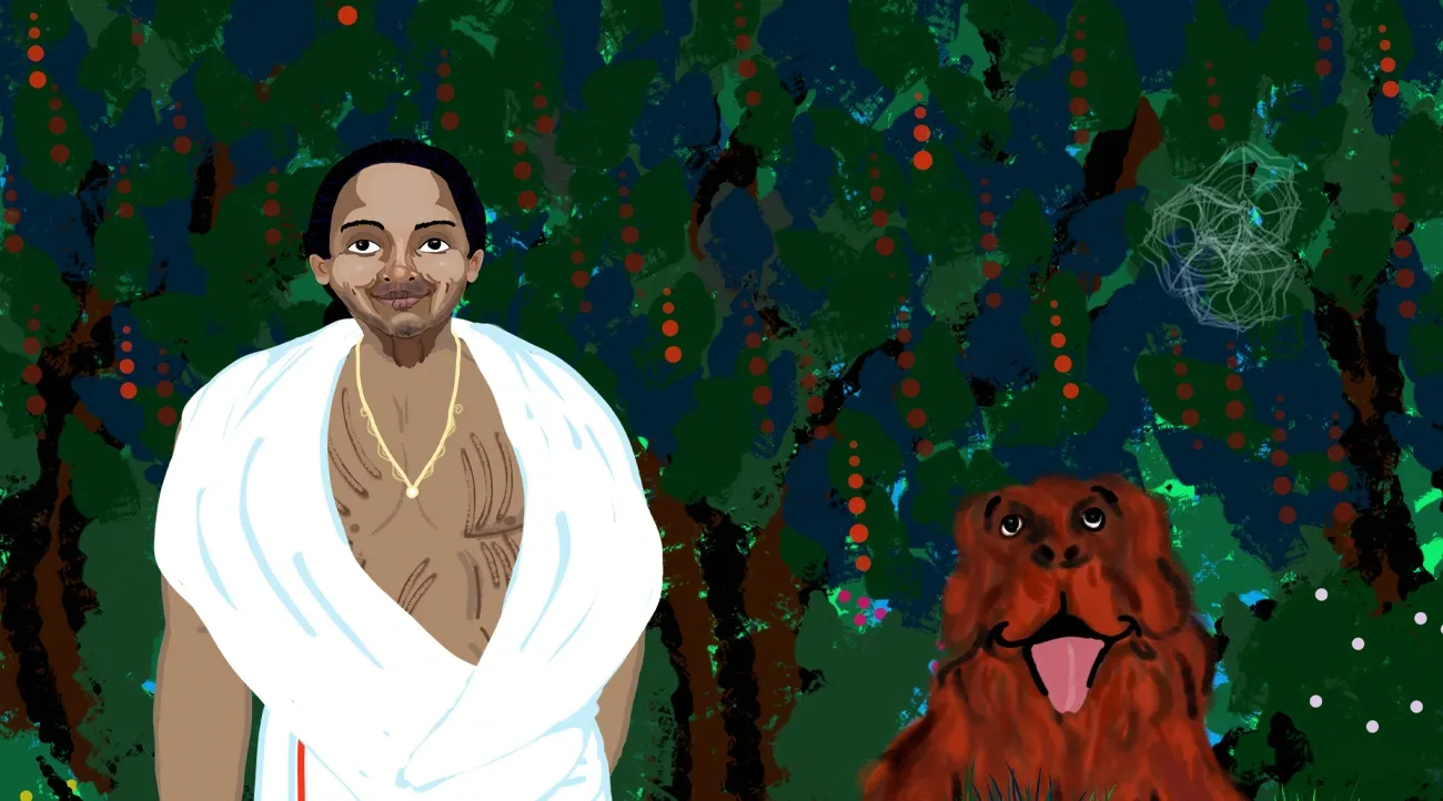അവരുടെ സ്ക്കൂളിലെ ഹയർസെക്കൻററി ചേട്ടനമാരുടെ അത്രയേ പ്രായം തോന്നൂ. നീണ്ട മുടി കെട്ടിവച്ചിട്ടുണ്ട്. മുഖത്ത് ഊശാൻ താടിയുണ്ട്. പൊക്കവും വണ്ണവും കുറഞ്ഞ് മെലിഞ്ഞ ഒരു പയ്യൻ. പക്ഷെ വലിയ, പാതിയടഞ്ഞ കണ്ണുകളും നല്ല സന്തോഷച്ചിരിയും. ആരും നോക്കിയിരുന്നുപോകും. മുണ്ടും മേൽമുണ്ടുമാണ് വേഷം. ആൾ ഷർട്ടിട്ടില്ലെന്നു കണ്ടപ്പോൾ പിള്ളേർക്ക് അതിശയം തോന്നി. രാജകുമാരൻ, പക്ഷേ ഷർട്ടില്ല.
