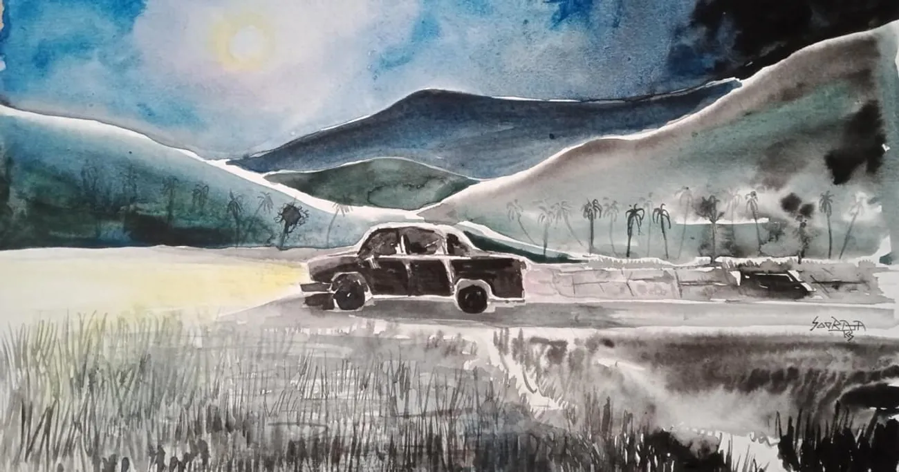 തെളിഞ്ഞ ഒരു വൃശ്ചികരാത്രിയായിരുന്നു അത്. പ്രകാശിച്ചുനിൽക്കുന്ന പാടങ്ങൾക്കും കുന്നുകൾക്കും നടുവിലൂടെ പെട്ടിയിലടച്ച ഇരുട്ടുപോലെ കാർ ഒഴുകി.