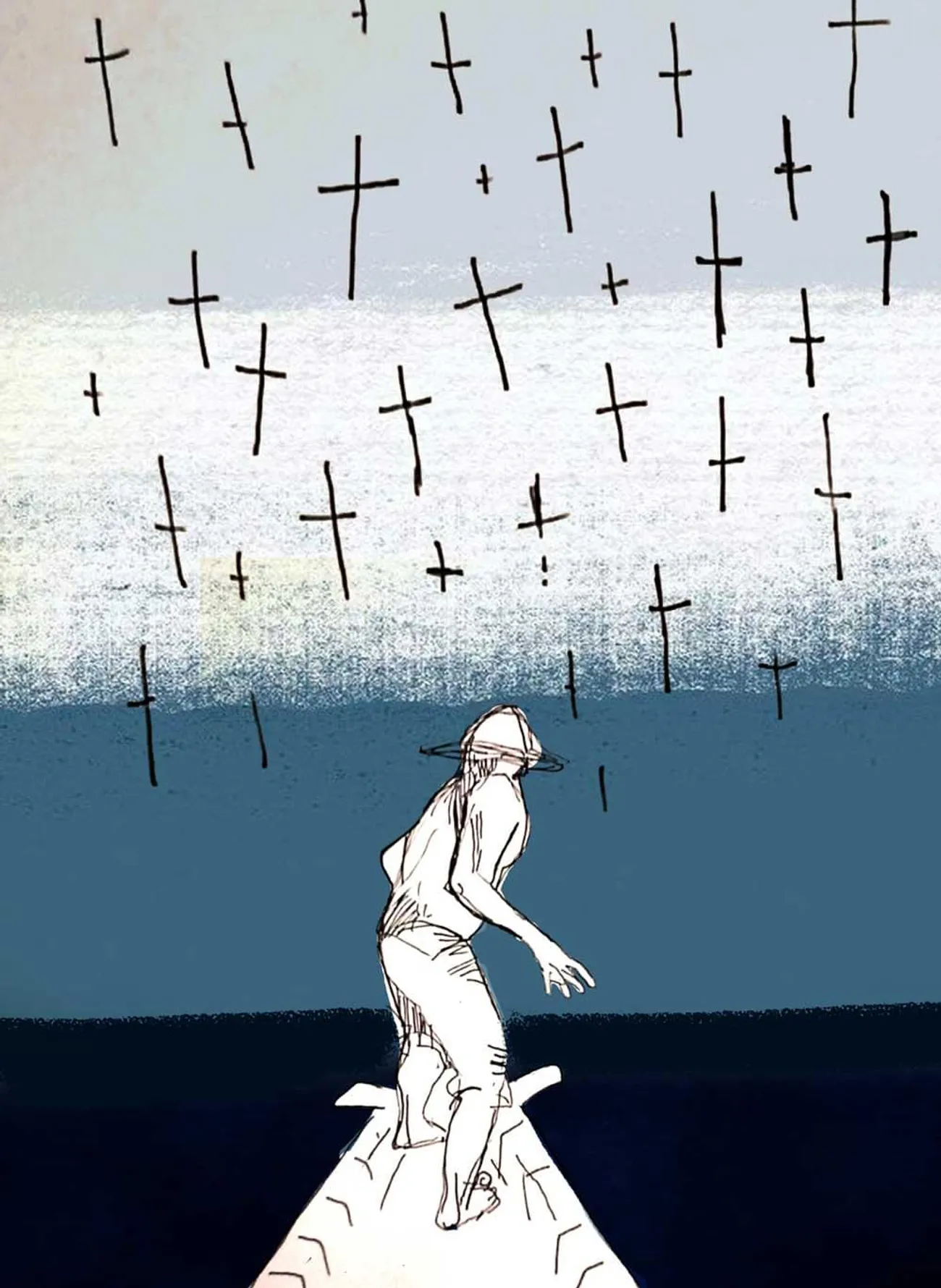 സെബാനെ, ഞാനന്ന് തനിച്ചാണ് കടലീ പോയത്. അതിനൊരു കാരണമുണ്ടായിരുന്നു. അതായത്, പുതിയ പാരുകൾ കണ്ടെത്താൻ അന്ന് ഞങ്ങൾക്കിടയിലൊരു കിടമത്സരമുണ്ടായിരുന്നു. അത് എന്താണെന്നു വച്ചാല്, ഈ പാരുകളിൽ നിറയെ മീനുണ്ടാവും. മറ്റാരേലുമത് കണ്ടെത്തുന്നതുവരെ നമ്മുടെ മാത്രം സ്വന്തമാണത്. അങ്ങനെയൊരു പാര് തെരഞ്ഞിറങ്ങിയ ഒരു ദിവസമായിരുന്നത്. അന്നത്ര നല്ല കടലായിരുന്നില്ല. മോശം കാലാവസ്ഥയിൽ എന്നേയും കട്ടമരത്തേയും കാറ്റ് മുകളിലേക്ക് വലിച്ചുകൊണ്ടു പോവുകയായിരുന്നു. ആദ്യമാദ്യം കരയിലെ ഓരോ കണിച്ചങ്ങൾ ഞാൻ കണ്ടിരുന്നു. പയ്യെ, ഒന്നും കാണാൻ കഴിയാത്ത മഴയായി. ദിക്കുപോലും അറിയാൻ കഴിയാതെ, പേടിച്ച് കട്ടമരത്തിൽ പിടിച്ചിരുന്നു. മണിക്കൂറുകൾ കഴിഞ്ഞ്, കാറ്റും കോളും ഒന്നടങ്ങിയപ്പോൾ ഞാൻ വിലങ്കിൽ എത്തിയിരുന്നു. ആ സമയത്ത് ഒന്നോ രണ്ടോ വലിയ കപ്പലുകൾ അടുത്തുകൂടെ പോവുകയും ചെയ്തു. ഭാഗ്യത്തിന് അതിനുള്ളിൽ പെട്ടില്ല. ഞാൻ ഓട്ടുമരം നേരെയാക്കി മാനത്തോട്ട് നോക്കി കുരുശുവെള്ള എവിടെയാണെന്ന് തിരഞ്ഞു. ഒരു പൊട്ടുപോലെ മാത്രമത് കണ്ടപ്പോൾ ഞാനങ്ങ് ഒഴുകിയൊഴുകി കടലിന്റെ വടക്കോട്ടാണ് എത്തിയതെന്ന് മനസ്സിലായി. അപ്പോഴും അത്യാവശ്യം ശക്തിയോടെ തന്നെ വാടക്കാറ്റ് വീശുന്നുണ്ടായിരുന്നു.