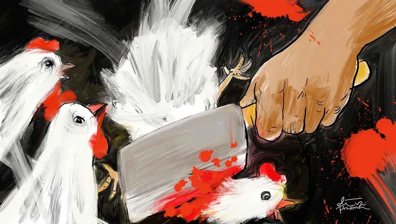 "അയാൾക്ക് അതൊരു ജോലി മാത്രമായിരുന്നു. തോലുരിക്കുന്നതും ഇറച്ചി തുണ്ടമാക്കുന്നതുമെല്ലാം ഒരു മറയുമില്ലാതെ ചെയ്യും. വെളിച്ചം മറച്ചുകൊണ്ട് അയാൾ അടുത്തുവരുമ്പോൾ കോഴികൾ മിണ്ടാതിരിക്കുന്നതു ഞാൻ കണ്ടിട്ടുണ്ട്. ഒതുങ്ങിക്കൂടി... വൈകാതെ തങ്ങളേയും കൊല്ലും എന്ന് അവയ്ക്കറിയാം. പക്ഷേ, ഒച്ചവച്ച് അതു നേരത്തേയാക്കേണ്ടല്ലോ എന്നൊരു കരുതൽ.'