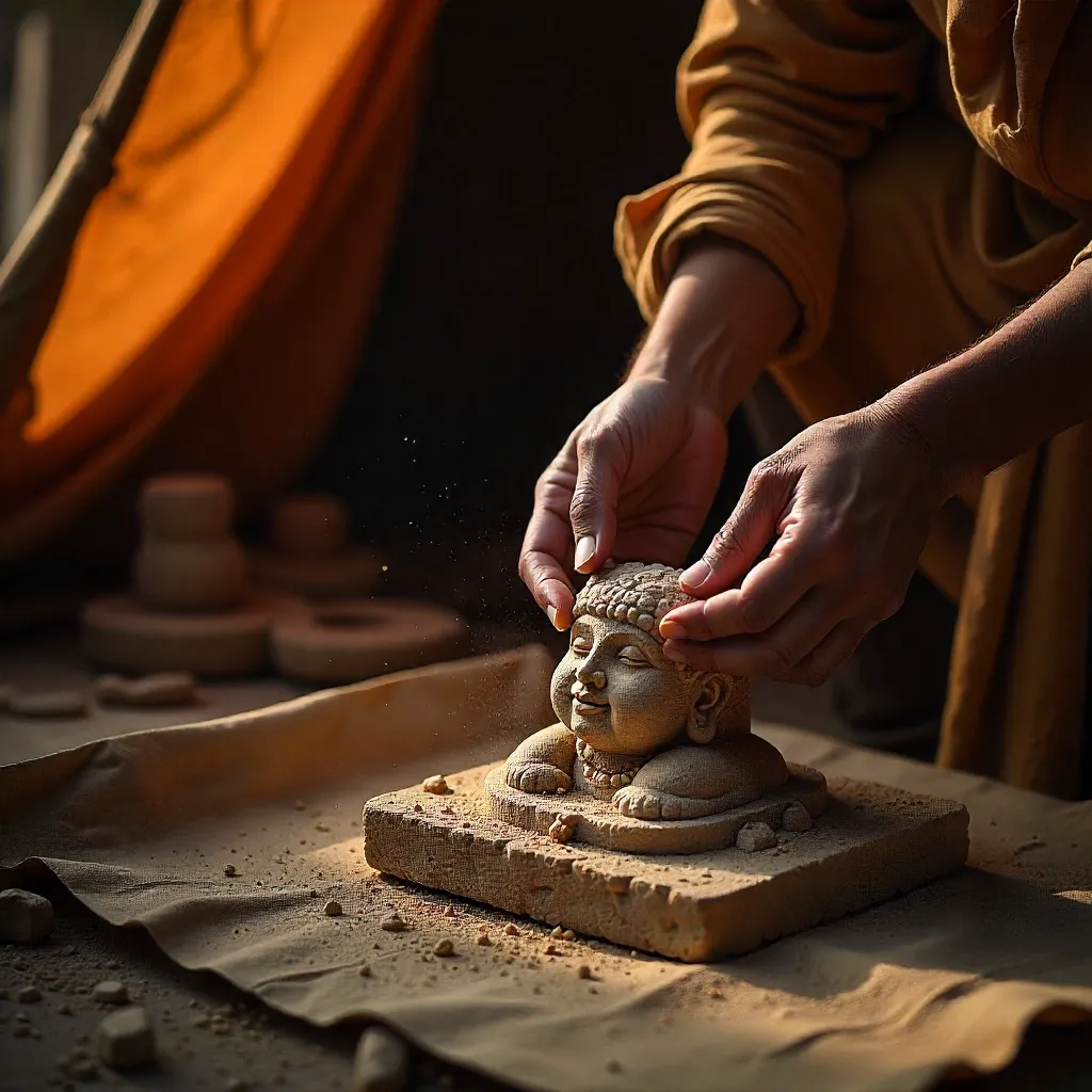 അയാൾ ശിൽപത്തിനു ചുറ്റും ആരതിയുമായ് നടന്ന് പ്രാർത്ഥനകൾ ഉരുവിട്ടു. ക്ഷേത്രത്തിന്റെ കിഴക്ക് വശത്തോട് ചേർന്നുള്ള ഒരു ടെൻ്റിലായിരുന്നു ശിൽപനിർമാണം. വളരെ ചെറിയ ടെൻ്റ് മതിയെന്ന് ആദ്യമേ പറഞ്ഞിരുന്നു. വലുപ്പം പലപ്പോഴും ശ്രദ്ധയെ തുരത്തുമെന്നും കൂടുതലാളുകളെ ആകർഷിക്കുമെന്നും ഭയന്നിരുന്നു. അതിലുപരി ചെയ്യാനിരിക്കുന്ന ഒളിപ്പോരിനെ ഏതെങ്കിലും വിധത്തിൽ അത് തകർത്ത് കളഞ്ഞേക്കുമെന്നും ആശങ്കയുണ്ടായിരുന്നു. അങ്ങനെ വന്നാൽ യുദ്ധം തുടങ്ങുന്നതിനുമുമ്പെ ബലിയാടാവേണ്ടി വന്ന ഹതഭാഗ്യനായ ഒരു ചെറുപ്പക്കാരനായ് തീരുമായിരുന്നു.