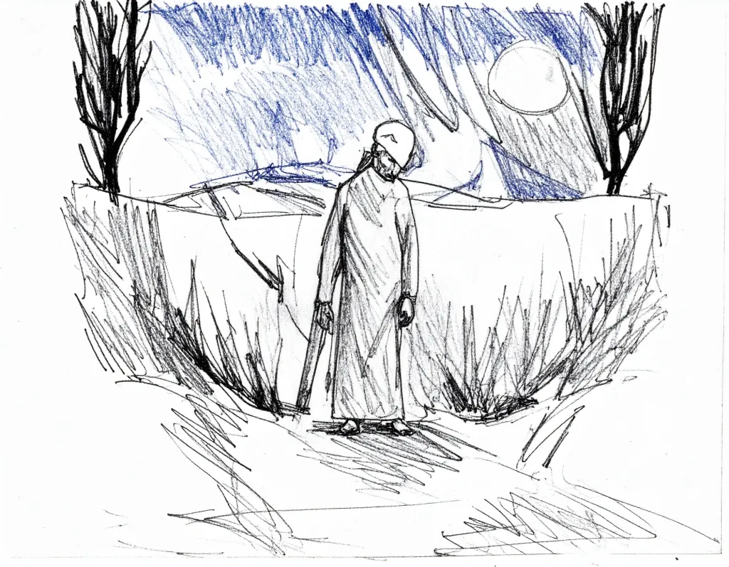 ഞെട്ടലോടെ തിരിഞ്ഞപ്പോൾ വയറിനുമുകളിലേക്ക് കയറ്റിയുടുത്ത നീല അറബി ലുങ്കിയും വെള്ള ബനിയനും വട്ടത്തൊപ്പിയുമിട്ട് ചെറിയ ഉസ്താദ് നിൽക്കുന്നു. ഉയരങ്ങളിൽ നിന്നു താഴോട്ടു നോക്കും പോലെ അവന്റെ ഉള്ളൻകാൽ തരിച്ചു. ഉസ്താദ് അടുത്തെത്തും തോറും തരിപ്പ് ശരീരമാസകലം പടർന്നുപിടിച്ചു. എന്തുകൊണ്ടോ അപ്പോൾ സത്താർ മൊല്ലാക്ക പറയുന്ന വിടുവായിത്തങ്ങളോർമ്മവന്നു.