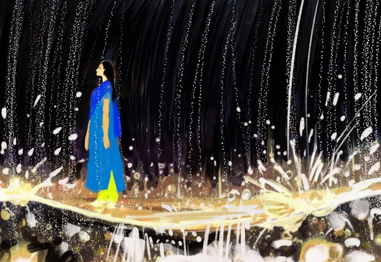 റോഡു സൈഡിൽ വീണു കിടക്കുന്ന വയലറ്റു പൂക്കൾക്കുമേൽ കാലെടുത്തു വെച്ചു. കണ്ണടച്ചു. നിശ്ചലം നിന്നു. മഴ അവൾക്കുമേൽ പെയ്തു. മൂർദ്ധാവിൽ, മുടിയിഴകൾക്കിടയിൽ, ചെവിപ്പിന്നിൽ, പിൻകഴുത്തിൽ, മുലകളിൽ ഊർന്നിറങ്ങിപ്പരന്നു മഴനീർ മുഴക്കങ്ങൾ. സാവധാനം കാലുകൾക്കിടയിലൂടെ ഇളം ചൂടുള്ള വെള്ളം ചുവപ്പു കലർന്ന് താഴോട്ടൊഴുകി.