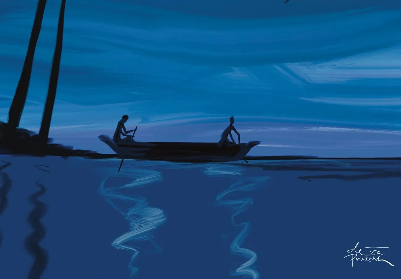ഒത്ത നടുക്ക് വന്നതും വള്ളം വശപ്പെശകായിട്ടൊന്ന് ഉലഞ്ഞു. എഴുന്നേറ്റ് മാറിയിരിക്കാൻ നോക്കിയ ആർക്കോ നില തെറ്റിയതാണ്. ഒരുപാട് നേരമൊന്നുമെടുത്തില്ല, വള്ളം തണ്ട് പിടിച്ചവൻ്റെ താളത്തിന് വഴങ്ങാതെ ഇടത്തോട്ടൊന്നു ചാഞ്ഞ് മുങ്ങിപ്പോയി.