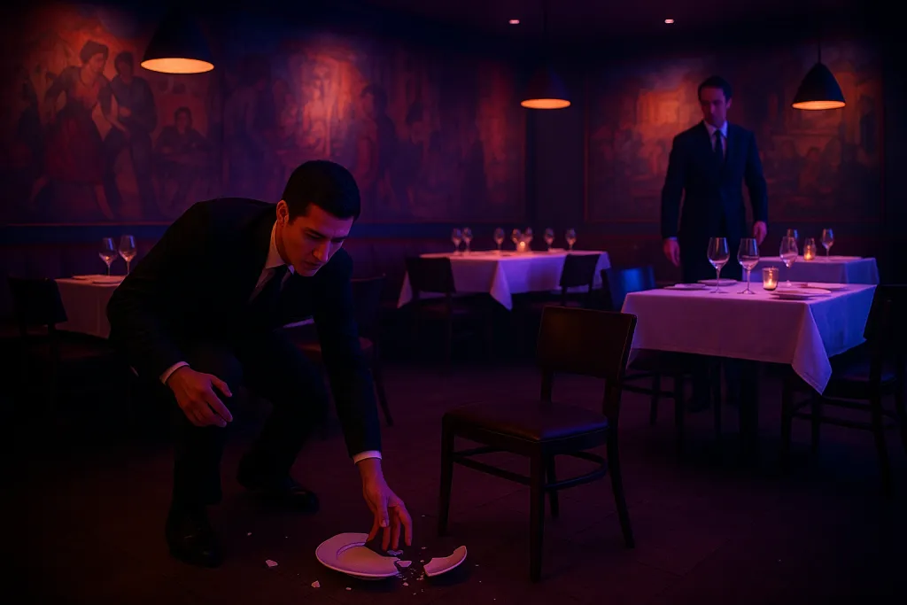 ഒരു മേശക്കരികിൽ എത്തിയപ്പോൾ എണീക്കാൻ നോക്കിയ ഒരുത്തനെ സ്ലാവ്കോ തോളിൽ അമർത്തി ഇരുത്തി. എന്താണ് നടക്കുന്നത് എന്നതിനെ കുറിച്ച് അറിയാത്തവർ ഒന്നും ശ്രദ്ധിക്കാതെ സംസാരവും ഭക്ഷണവും പാനീയവും തുടർന്നു.