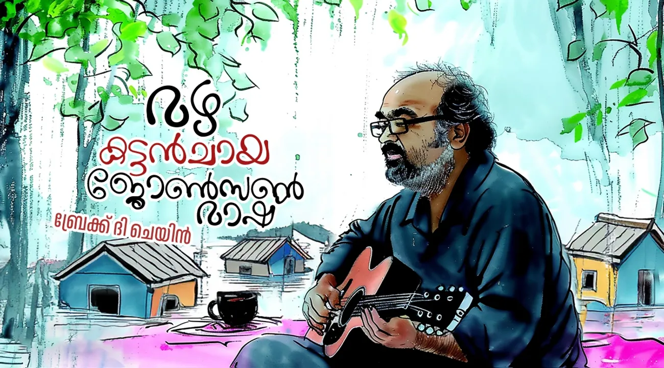 നോക്കുമ്പോഴുണ്ട് ഒരു ചെറുപ്പക്കാരൻ. അയാളുടെ മുണ്ടും ഷർട്ടും മഴയിൽ കുതിർന്നിരുന്നു. കുറിയ താടിരോമങ്ങളിൽ നിന്നും നെറ്റിയിലേക്ക് വീണ മുടിയിഴകളിൽ നിന്നും മഴയുടെ കുഞ്ഞുങ്ങൾ ഇറ്റുവീഴുന്നു. അയാളുടെ കയ്യിലെ ഗിറ്റാറാണ് ആരും ആദ്യം ശ്രദ്ധിച്ചുപോവുക.