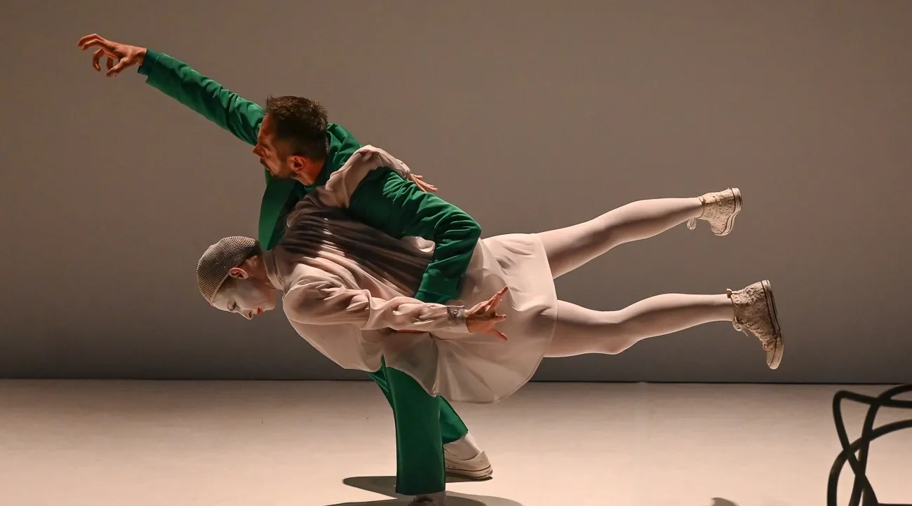 In the opening sequences, the movement is primal, echoing the "meaningless creatures" we were seventy thousand years ago in the African savannah. There is a raw, animalistic honesty in the way Vlčeková and Raček occupy the floor. This isn't "pretty" dance; it is Tanztheater (Dance Theatre) in its purest form, where the body is used as an instrument of labour. The physicality of the male actor, Daniel Raček, is particularly arresting. His body serves as a topographical map of the Anthropocene taut, muscular, and perpetually strained. We see both dancers simulate the damming of rivers and the raising of cities not through pantomime but through sheer physical tension. Their muscles ripple and quiver under the strain of an invisible weight the weight of "progress." As the piece progresses, this organic movement becomes mechanical, then frantic, then finally, exhausted. The transition mirrors our own leap from the steam engine to the spaceship. The dancers' bodies become sites of colonisation; they are twitchy, hyper-stimulated, and yet profoundly lonely.