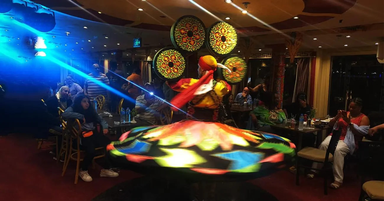 മൂന്നുമണിക്കൂർ നീണ്ടുനിൽക്കുന്ന നിശാപാർട്ടിയിൽ ബെല്ലി നൃത്തവും തന്യൂറാ നൃത്തവും ഭക്ഷണവും കഴിക്കാനായിട്ടുള്ള സൗകര്യങ്ങൾ ഏർപ്പാടാക്കിയിട്ടുണ്ടായിരുന്നു ടൂർ ഗൈഡ്. ഈദ് ആയതുകൊണ്ടോ, അതോ എല്ലാ ദിവസവും അങ്ങനെ തന്നെയോ എന്നെനിക്കറിയില്ല, വലിയ തിരക്കായിരുന്നു ആ ബോട്ടിൽ. ബോട്ടിലേക്ക് കയറിച്ചെല്ലുന്നതിന്റെ വലതുവശത്തായി ഒരു വലിയ ഹാളുണ്ടായിരുന്നു. പലയാളുകൾ കയറിവന്ന് ഓരോരോ മേശമേൽ ഇരിപ്പായി. ഞങ്ങൾ ഓടിച്ചെന്ന് നടുത്തളത്തിന്റെ തൊട്ടടുത്തുള്ള കസേരയിലിരുന്നു. അവിടെ പാട്ട് പാടാൻ കോപ്പ് കൂട്ടുകയായിരുന്നു ഗായകൻ. മെലിഞ്ഞു നീണ്ട്, കോട്ടും സ്യൂട്ടും ധരിച്ച ഗായകൻ പാടിത്തുടങ്ങി. സുഡാൻ, കെനിയ, ടുണീഷ്യ, ഫിലിപ്പീൻസ് തുടങ്ങിയ പല രാജ്യങ്ങളിൽ നിന്നുള്ളയാളുകൾ സന്നിഹിതനായിരുന്നു അവിടെ.