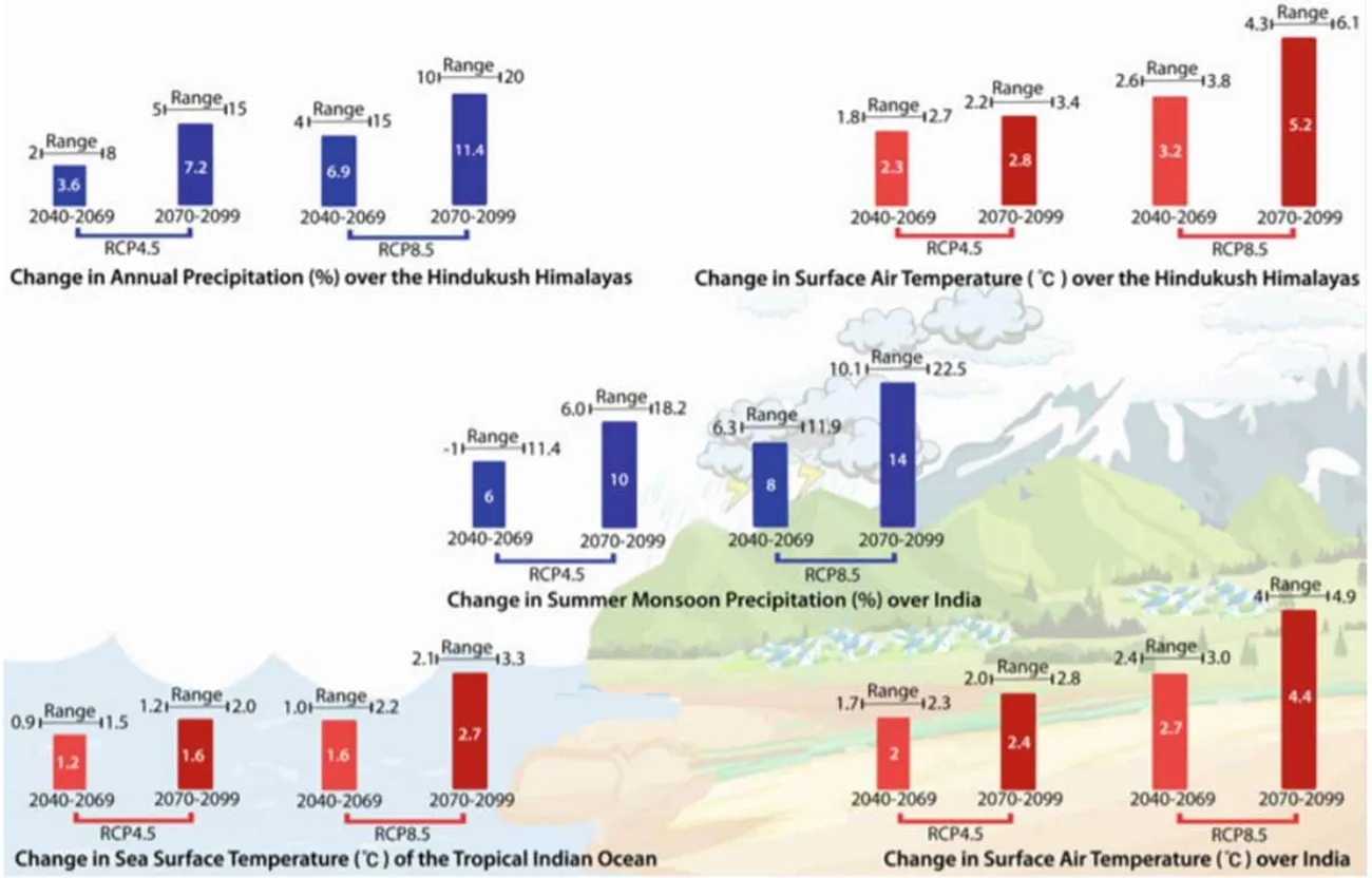 ഇരുപത്തിയൊന്നാം നൂറ്റാണ്ടിന്റെ അവസാനത്തോടെ, ‘ആർ.സി.പി 8.5’ സാഹചര്യത്തിൽ എച്ച്.കെ.എച്ചി.നേക്കാൾ വാർഷിക ശരാശരി ഉപരിതല താപനില 5.2 ഡിഗ്രി സെൽഷ്യസ് വർധിക്കുമെന്ന് പ്രതീക്ഷിക്കുന്നു. ‘ആർ.സി.പി 8.5’ സാഹചര്യത്തിന് കീഴിലുള്ള സി.എം.ഐ.പി-5 (Climate Model Inter comparison Project) പ്രൊജക്ഷനുകൾ വാർഷിക മഴയുടെ വർധനവ് സൂചിപ്പിക്കുന്നു. പക്ഷേ ഇരുപത്തിയൊന്നാം നൂറ്റാണ്ടിന്റെ അവസാനത്തോടെ എച്ച്.കെ.എച്ച് മേഖലയിൽ മഞ്ഞുവീഴ്ച കുറയുന്നുവെന്ന് മോഡലുകൾ സൂചിപ്പിക്കുന്നു.