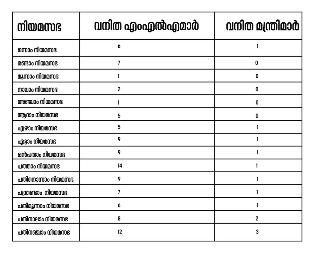 ഇതുവരെയുള്ള കേരള നിയമസഭകളിലെ വനിതാ പ്രാതിനിധ്യം;